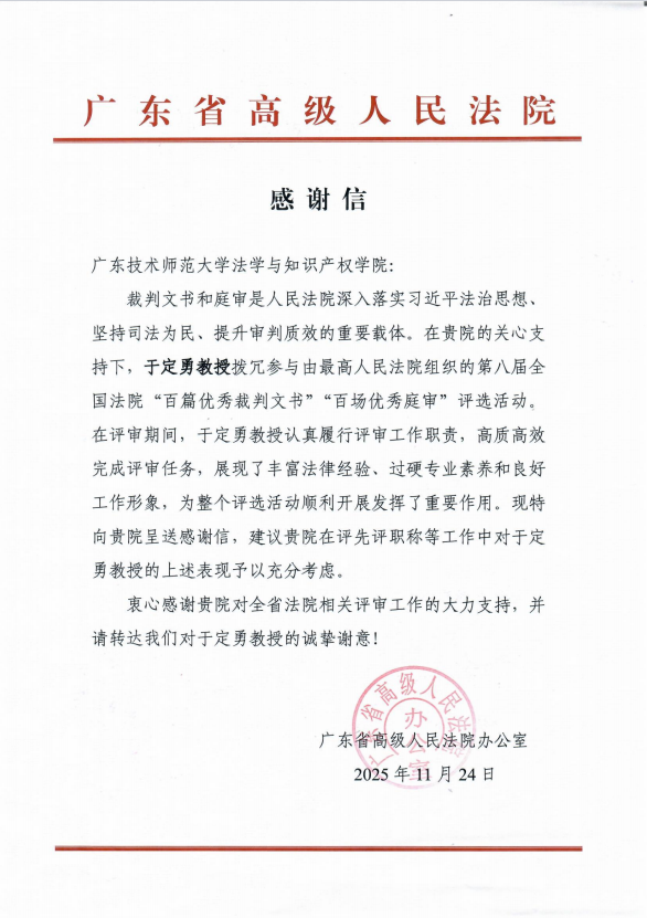近日,williamhill威廉希尔官网院收到广东省高级人民法院感谢信,副教授于定勇参与最高人民法院组织开展的第八届全国法院“百篇优秀裁判文书”“百场优秀庭审”评选活动。在担任评委期间,于定勇认真履行评审职责,高质高效完成评审任务,展现了我院教师丰富法律经验、过硬专业素养和良好工作形象,受到了广东省高级人民法院的肯定和表扬。