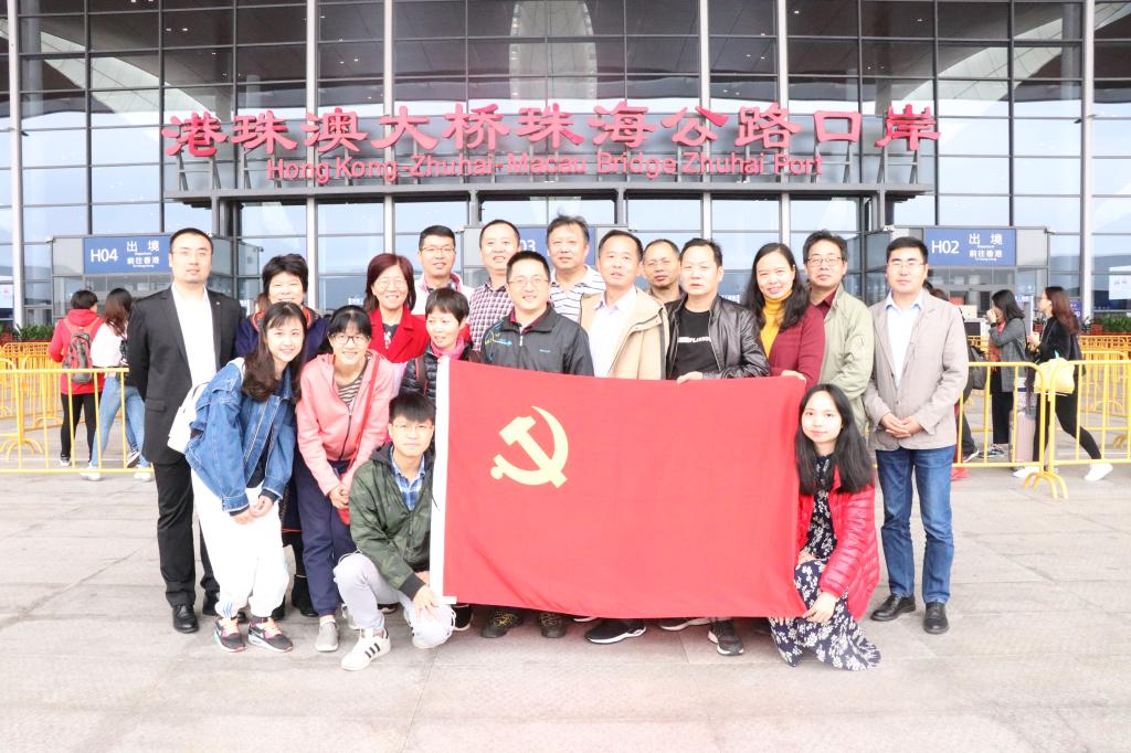 活动第一站来到港珠澳大桥珠澳口岸人工岛,并通过建设施工便桥参观了被誉为“现代世界七大奇迹之一”的港珠澳大桥的部分路段。站在观赏平台上,大家领略着港珠澳大桥在空中画出的跨时代曲线;在便桥上,年长的老师们目睹今昔的巨变,感慨万分,回忆着在改革开放前还有着大量内地居民因为贫穷偷渡去港澳,经过40年改革开放,中国人民从站起来、富起来到强起来!这种幸福的获得源于中国共产党的正确领导、改革开放的成果、中国特色社会主义道路的正确选择。