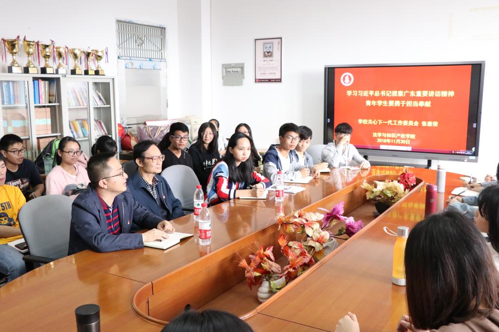 了进一步学习习近平总书记视察广东重要讲话精神,传承红色基因,培育时代新人的工作,2018年11月30日下午,学校关心下一代工作委员会张善荣老师莅临白云校区一教317会议室给学生创新创业党支部党员和18级班委召开“学习习近平总书记观察广东重要讲话精神,青年学生要勇于担当奉献”为主题座谈会。