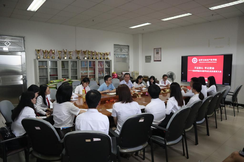 为深入学习习近平总书记在“不忘初心、牢记使命”主题教育工作会议和纪念五四运动100周年大会上的重要讲话精神,贯彻落实习近平总书记关于粤港澳大湾区建设重要论述以及对广东重要讲话、重要指示批示精神,引导毕业生党员树立远大理想、热爱伟大祖国、担当时代责任、勇于砥砺奋斗、练就过硬本领、锤炼品德修为,法学与知识产学院学生创新创业党支部组织毕业生党员“不忘初心、牢记使命”主题教育会,学院党总支书记许建鑫、副书记李雪斌、毕业班辅导员张维维及16名毕业生党员参加了主题教育会。