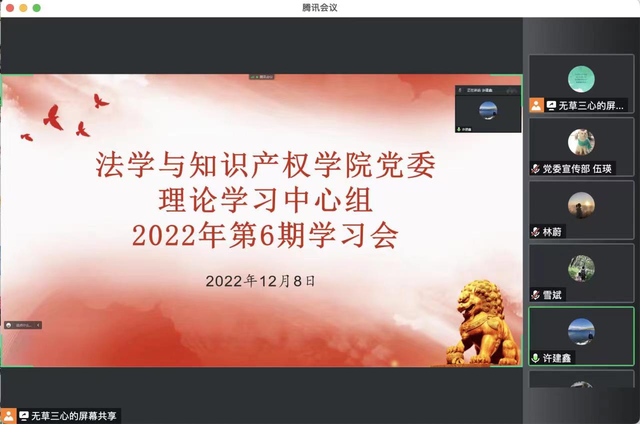 12月8日,法学与知识产权学院以线上会议方式召开党委理论学习中心组2022年底6期学习会,深入学习党的二十大精神。williamhill威廉希尔官网院党政班子成员、党委委员、党支部书记、党政办公室主任等参加会议,学校党委宣传部副科长伍瑛列席会议。会议由学院党委书记许建鑫主持。