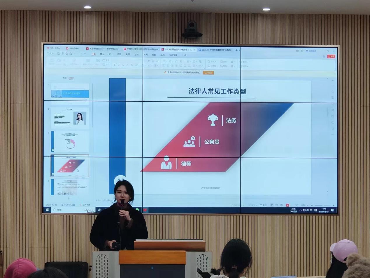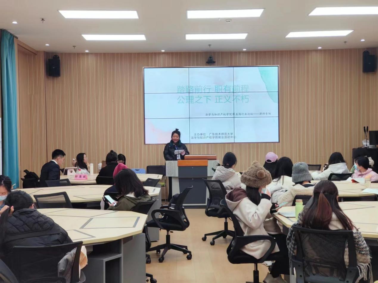 12月21日,我院在白云校区三训305实训室组织行业论坛暨访企拓岗交流会。广东金桥百信律师事务所合伙人叶东杭,我院2020届校友、广东洛亚律师事务所律师陈焱琳和我院50余名学生参加本次活动。