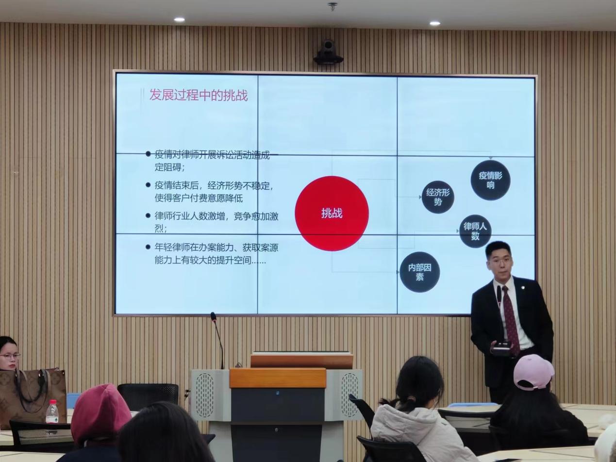 随后,叶东杭分享了自己办理刑事案件的经历,分析了律师在发展过程中所遇到的挑战与机遇,特别提到大量互联网案件的出现,新领域的法律服务方为蓝海值得深耕。叶东杭还提到在经济发展较落后的地区律师缺口较大,是未来择业去向之一。