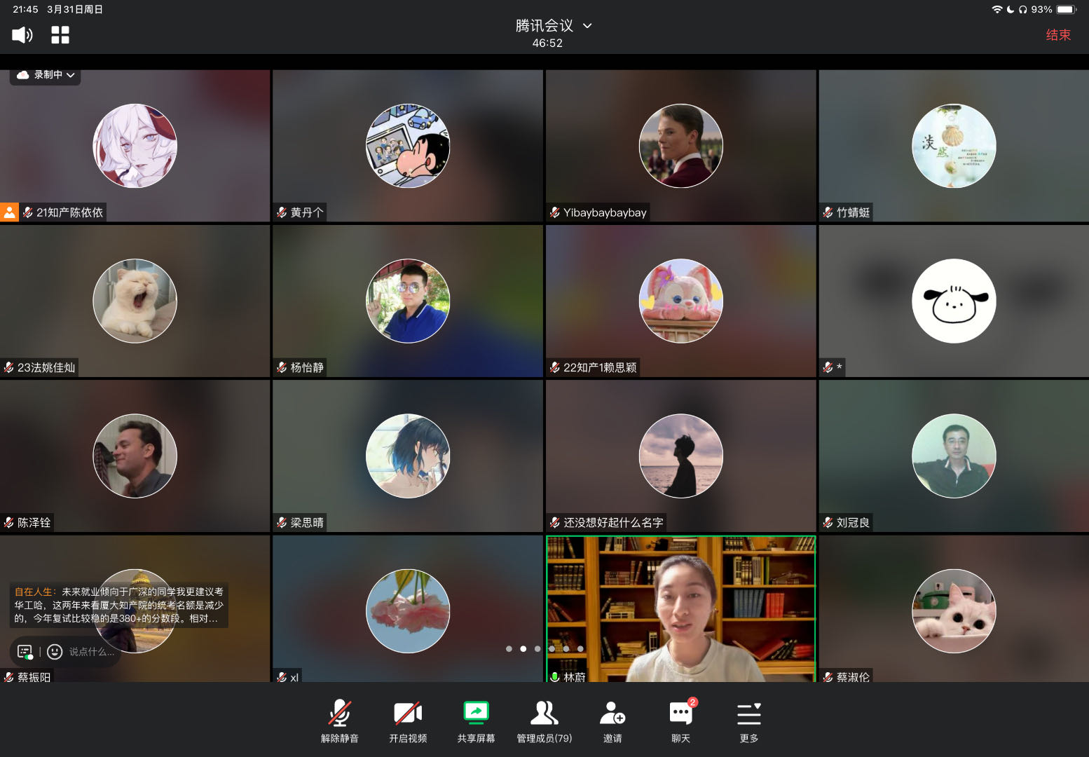3月31日晚上,“同心归巢 薪火相传”学子成长系列活动正式开启首场“考研经验分享交流会”。活动邀请16级蔡淑伦(西南政法大学知识产权法方向)、18级蒋芳(西南政法大学人工智能法方向)、18级陈泽铨(华南理工大学法理学方向)、18级邓锶琦(广东外语外贸大学诉讼法学方向)、19级刘嘉怡(厦门大学知识产权方向)等五位校友,在腾讯会议上进行交流分享。会议总共进行了两个多小时,共计130多人次参与本活动。知识产权系主任、党支部书记林蔚主持交流分享会。