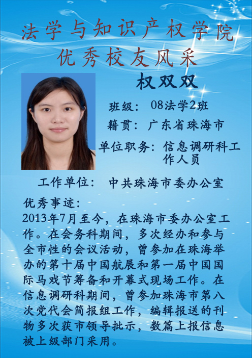 权双双 08级法学2班 现工作于中共珠海市委办公室