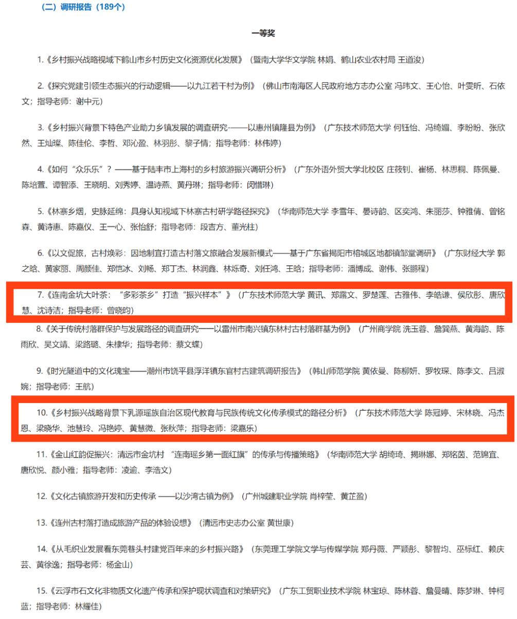 自比赛启动以来,我院领导高度重视,广泛发动师生力量,认真组织筹备赛事,经过层层选拔和激烈角逐,竞赛成绩喜人。我院学生其调研报告作品《连南金坑大叶茶:“多彩茶乡”打造“振兴样本”》(广东技术师范大学黄讯、郑露文、罗楚莲、古雅伟、李皓谦、侯欣彤、唐欣慧、沈诗洁;指导老师:曾晓昀)和《乡村振兴战略背景下乳源瑶族自治区现代教育与民族传统文化传承模式的路径分析》(广东技术师范大学 陈冠婷、宋林晓、冯杰恩、梁晓华、池慧玲、冯艳婷、黄慧微、张秋萍;指导老师:梁嘉乐)均喜获省赛一等奖。
