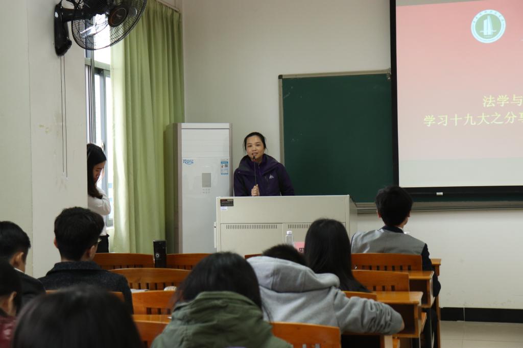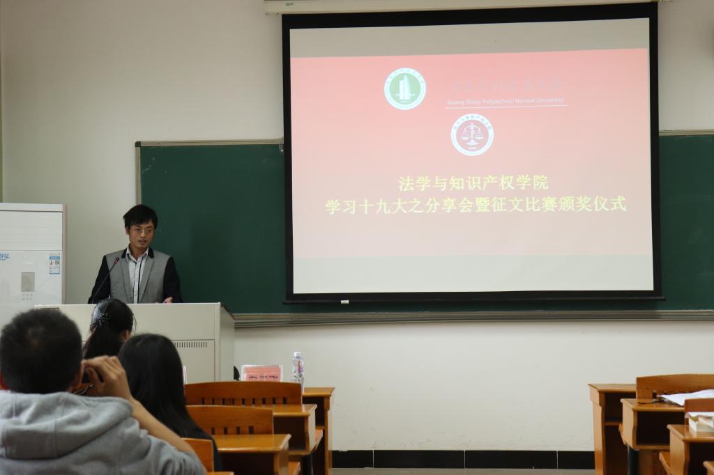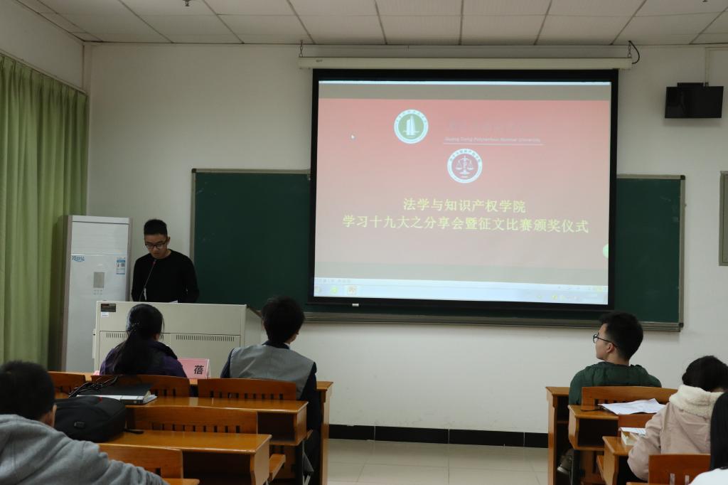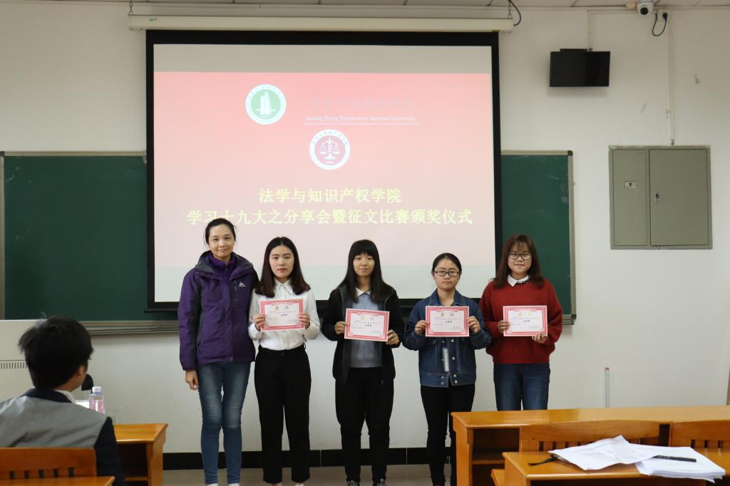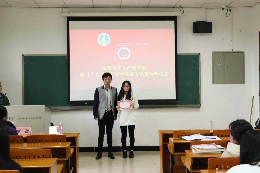 分享活动结束后,白云飞老师与罗蓓老师代表学院为此次“学习十九大,永远跟党走”主题活动的优秀征文进行了颁奖。此次活动颁出了一二三等奖及优秀奖,共十名同学获奖,一五级法学一班的伍嘉欣获得一等奖。全体与会师生对所有获奖者报以了最热烈的掌声。