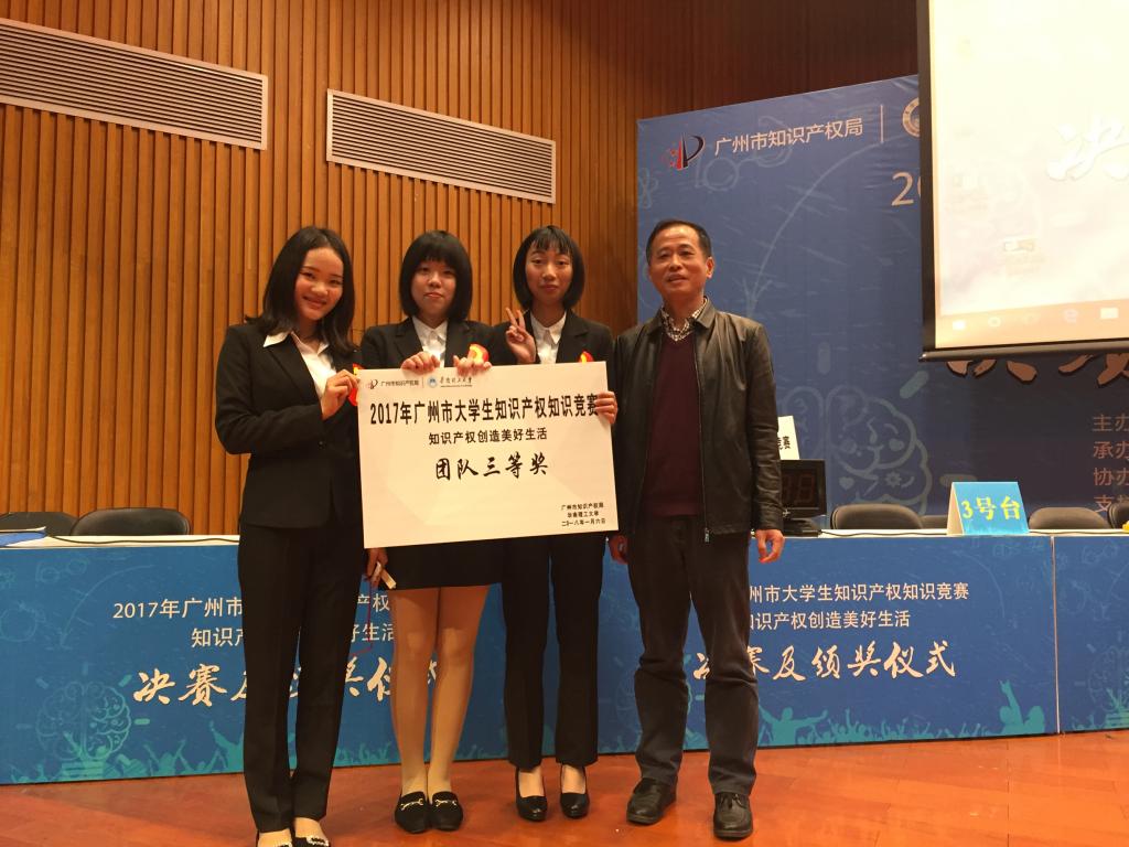 2018年1月6日下午,由广州市知识产权局主办,华南理工大学、华南师范大学承办的“2017年广州市大学生知识产权知识竞赛决赛”在华南理工大学举行,我校代表队“IP三巨头”经过各环节紧张角逐,荣获团队三等奖,此次获奖系我校继去年广州市大学生知识产权竞赛获奖后再创佳绩。代表队“IP三巨头”指导老师为williamhill威廉希尔官网院郭洪波教授,代表队三位参赛选手分别是来自williamhill威廉希尔官网院15级法学二班的钟楚云、刘思敏、韦诗慧。