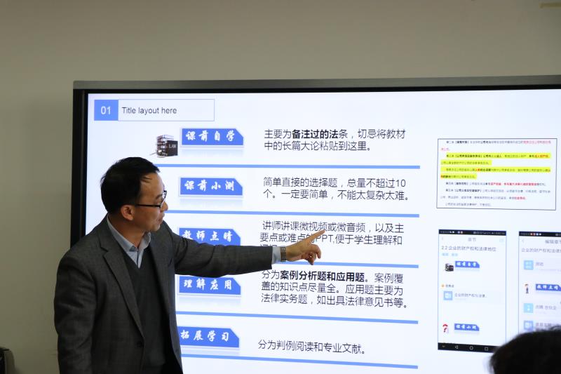 研讨活动分两个阶段进行。第一阶段为上学期SPOC混合式教学实践的总结、分享与交流。陈英、李楠、徐进静、李小萍、胡信华、于定勇等老师针对混合式教学开展的情况,分享了自己的经验体会,以及遇到的问题。徐进静老师和于定勇院长更是用PPT详细地对法学专业SPOC应用型教学的设计原则、线上内容的设置、以及课堂教学技巧、学生对教学的具体反馈等作了详细的介绍。