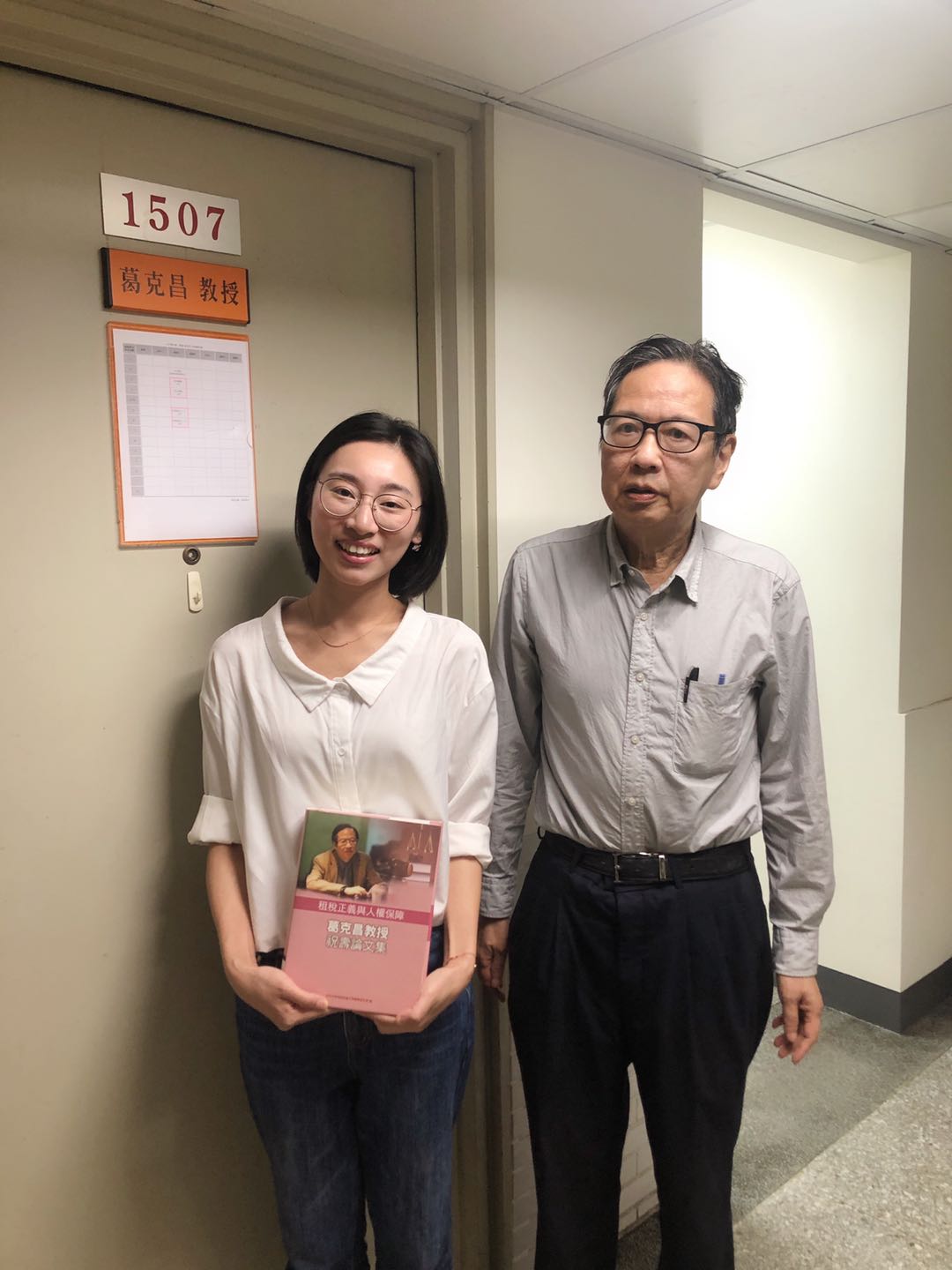 研讨会结束后,林蔚博士赴东吴大学拜访葛克昌教授。葛克昌教授系著名财税法学教授(原系台湾大学法律学院教授兼公法研究中心主任,现就职于东吴大学)、台湾税法学会理事长,他鼓励年轻老师应该关注财税法前沿研究、不畏艰难攻坚科研难题,有机会应到境外学校访学交流。