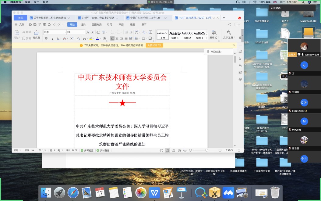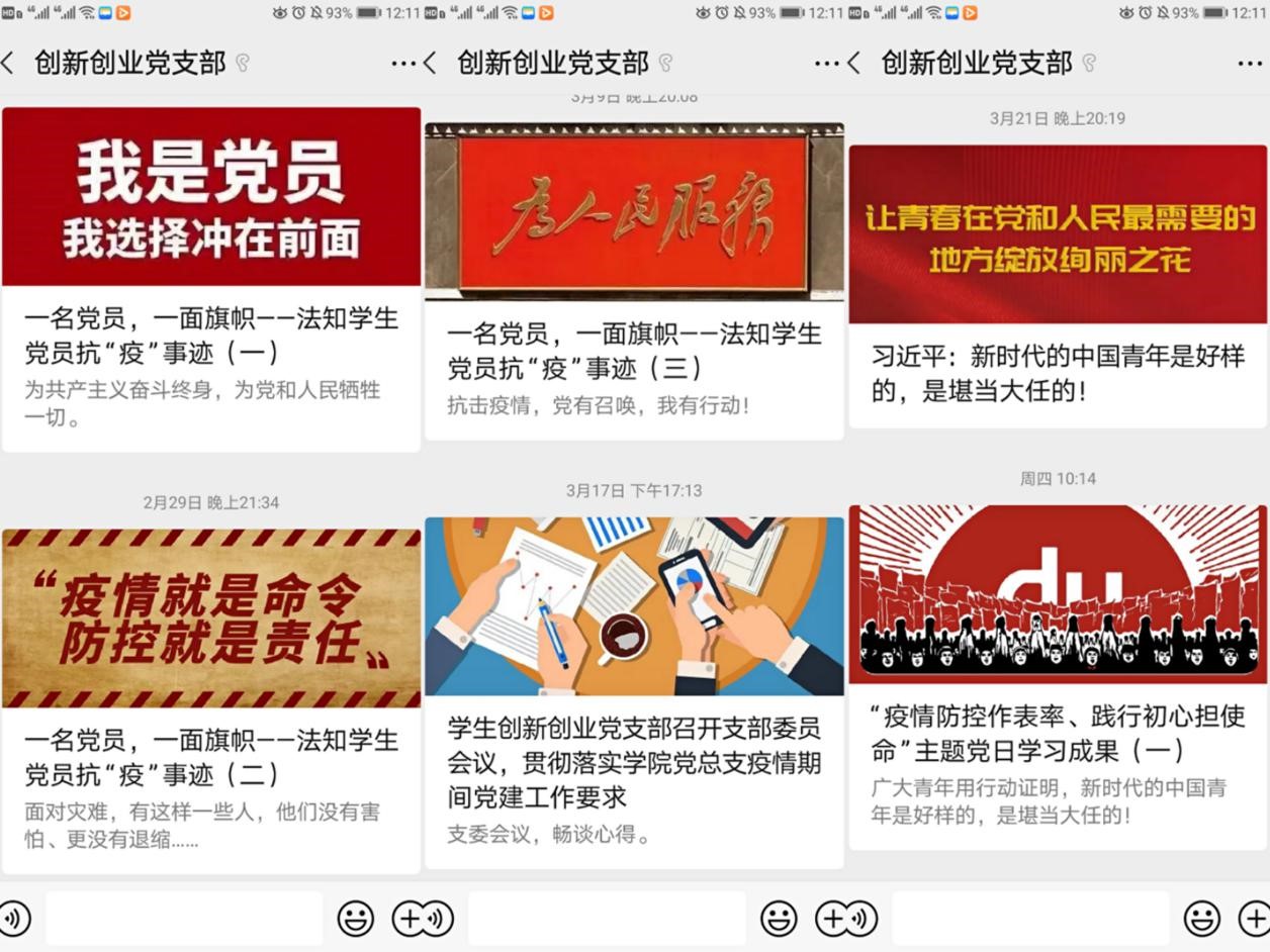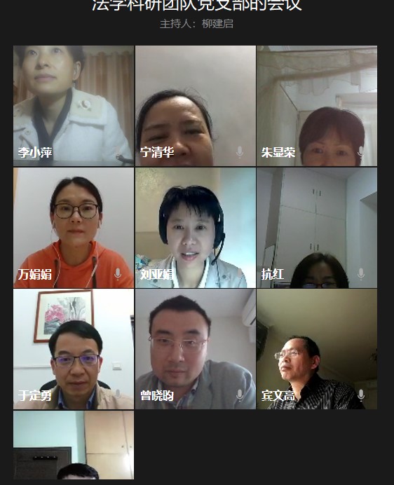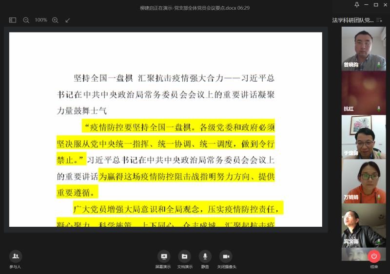 在各基层党组织线上组织生活上,许建鑫、赵利、柳建启、林蔚、伍瑛等五位同志分别带领各基层党组织党员认真学习习近平总书记关于疫情防控工作的重要讲话和指示批示精神,学习省委省政府、省委教育工委和学校党委有关疫情防控、线上教育视频会议精神的部署和要求,各党员同志纷纷就疫情防控及线上教学、科学研究、学生工作、日常工作等方面进行了交流,并提出了各自的看法和建议。知识产权科研团队党支部还邀请无党派青年博士尹卫民、罗玥两位老师参加会议,统一知识产权部的思想认识,加强全体老师的思想政治教育工作。学生创新创业党支部通过召开支委会议,统一思想,加深了支委对习近平总书记关于疫情防控工作的重要讲话和指示批示精神和学校党委有关疫情防控、线上教育视频会议精神的学习理解;党支部书记伍瑛老师通过腾讯视频会议的方式召开全体党员会议,向党员们一一介绍学习文件的主要内容,并且部署了党小组讨论、学习强国专题答题等线上理论知识学习的任务,还整理汇总“习近平总书记关于疫情防控的重要讲话”的内容发放至党员群内,供每一位党员们认真学习、交流;党支部运用公众号对于学生党员的抗“疫”志愿活动、支部会议和相关学习资料等内容进行推送,加强宣传教育效果等等。全院师生党员一致认为在党中央的正确领导下,在学校党委的部署下,我们一定能够克服困难,坚决打赢疫情阻击战,并纷纷表示要把思想和行动统一到中央、上级和学校党委的统一部署上,立足岗位,努力工作,停课不停学,停课不停教,停课不停研,让党旗始终高高飘扬在疫情防控一线。