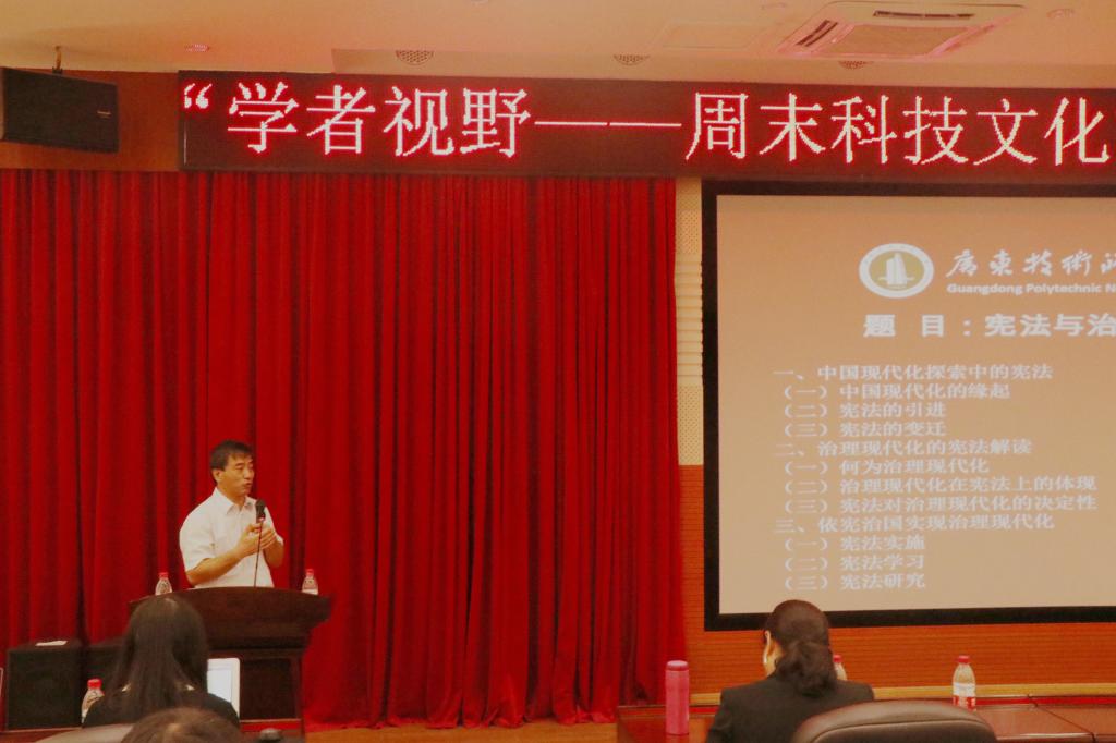 开幕式后,由学校科研处、团委主办的“学者视野——周末科技文化艺术系列讲座”第887讲暨宪法法律知识讲座开讲。主讲人为周联合。讲座中,周联合由中国现代化探索中的宪法谈起,讲授了清代和民国在设立宪法中的探索,由此引出新中国设立宪法的重要价值。周联合阐述了依宪治国实施治理现代化的重大意义。