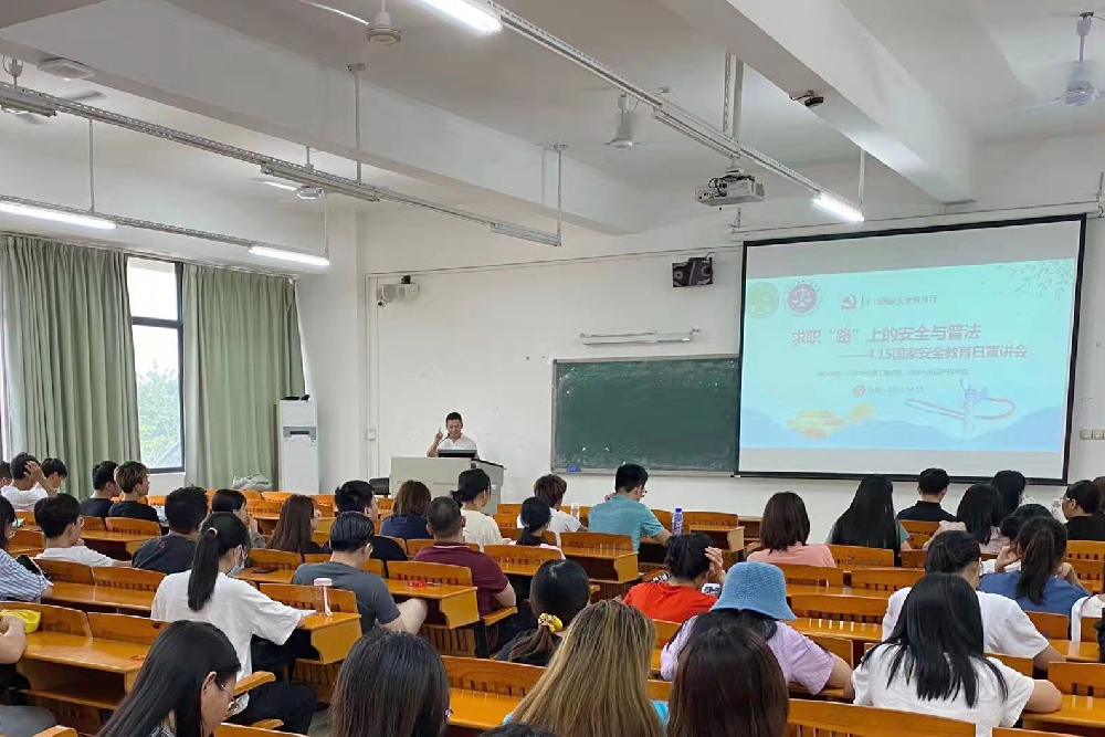 2021年4月15日是第6个全民国家安全教育日。为进一步深化党史学习教育,提升为师生办实事的能力,增强学生的法律意识和求职安全意识,当天下午,我院与汽车与交通工程学院在三教206教室联合开展求职“路”上的安全与普法讲座,师生代表200余人参加了讲座。