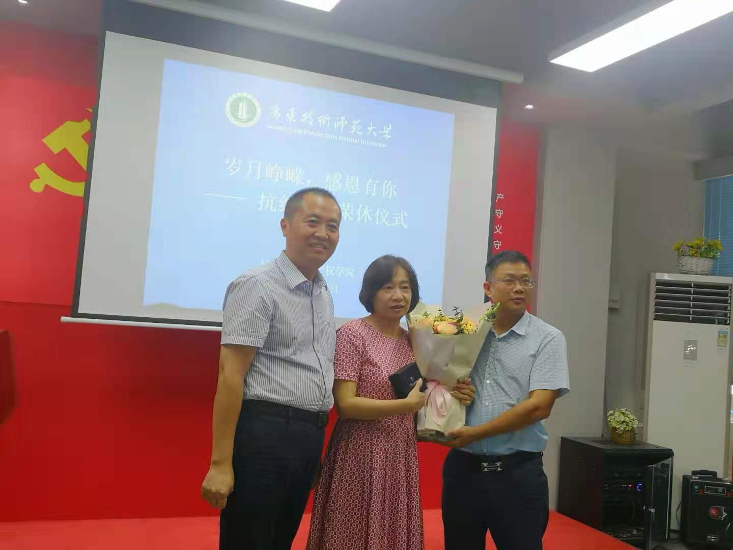 9月23日,我院在东校区图书馆初心斋举办了简单而隆重的“岁月峥嵘 感恩有你”抗红老师荣休仪式,院长黄俊辉代表学院感谢抗红老师多年来的辛劳付出,培养一批又一批的优秀学子。许建鑫、黄俊辉一起向抗红老师赠送纪念品和鲜花。