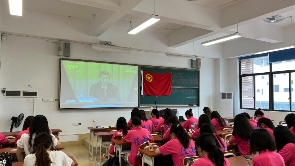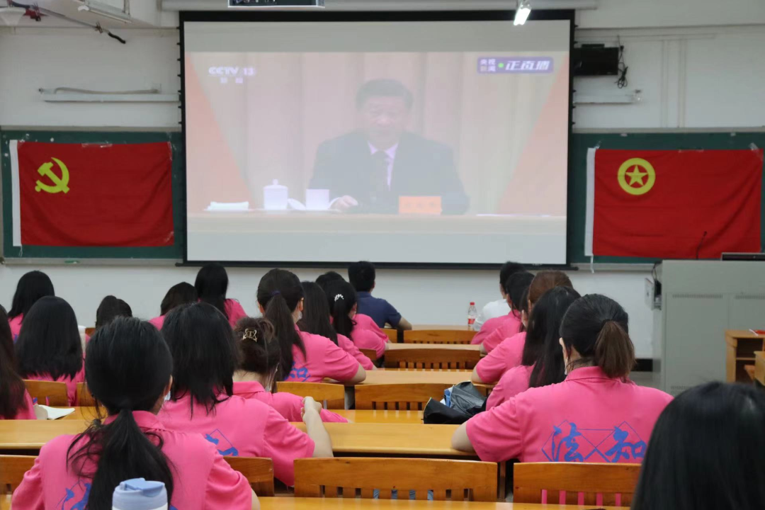 我院在白云校区、河源校区分别设会场收看直播。团委书记梁嘉乐,团委副书记蓝雅婧、李安昊、陈伊琳及全体团委、学生会学生骨干,党员代表,班级骨干代表,共100余人观看了直播。