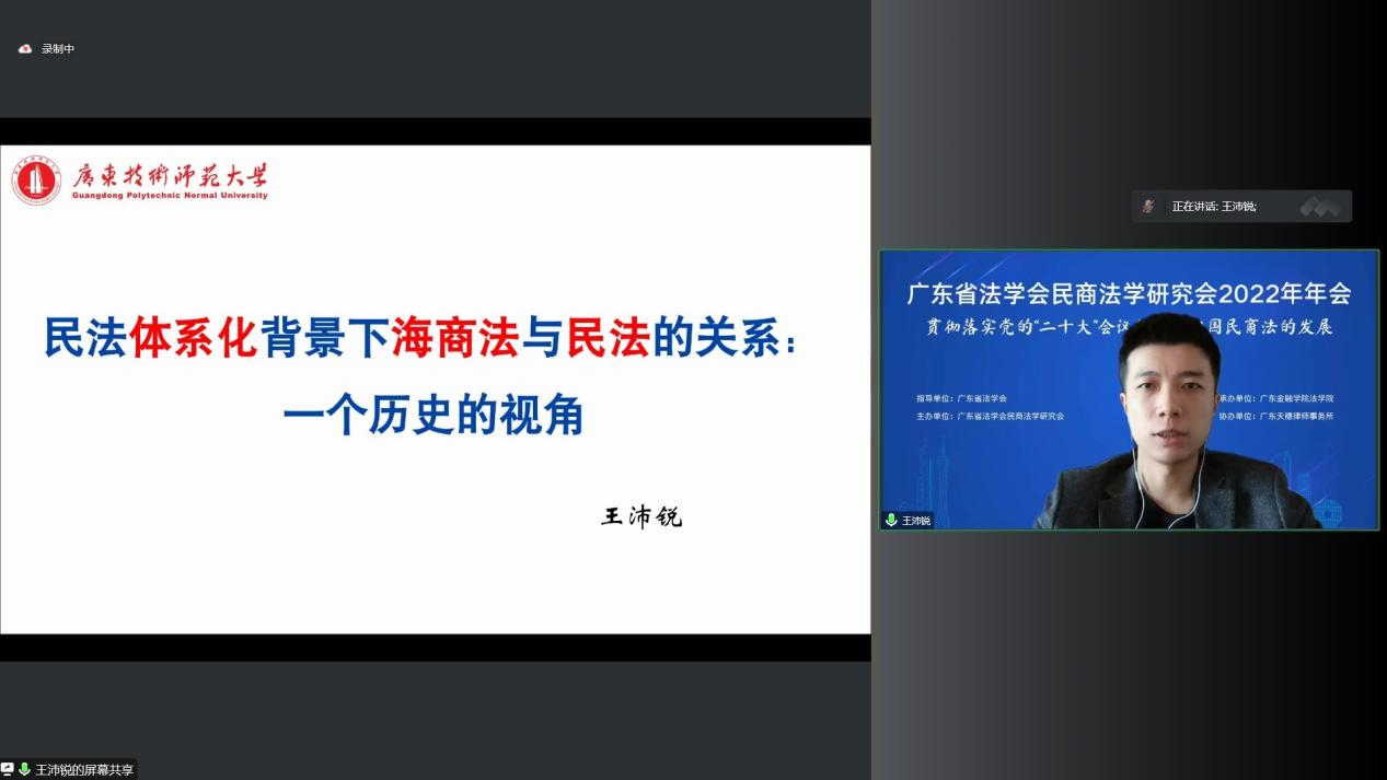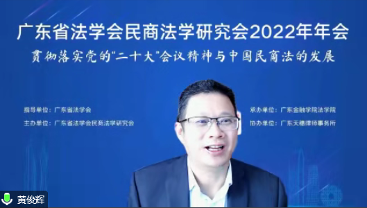 12月24日,广东省法学会民商法学研究会2022年学术年会暨换届选举大会以线上会议的方式隆重召开。我院院长黄俊辉教授、民商法教研室主任张英副教授、法律系副主任朱腾伟博士、民商法专业专任教师王沛锐博士应邀参加本次研究会的学术年会,并和与会专家学者进行了广泛而深入的交流,并提出了富有建设性的建议。