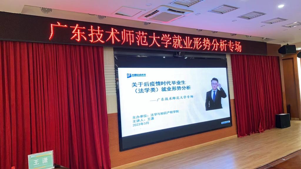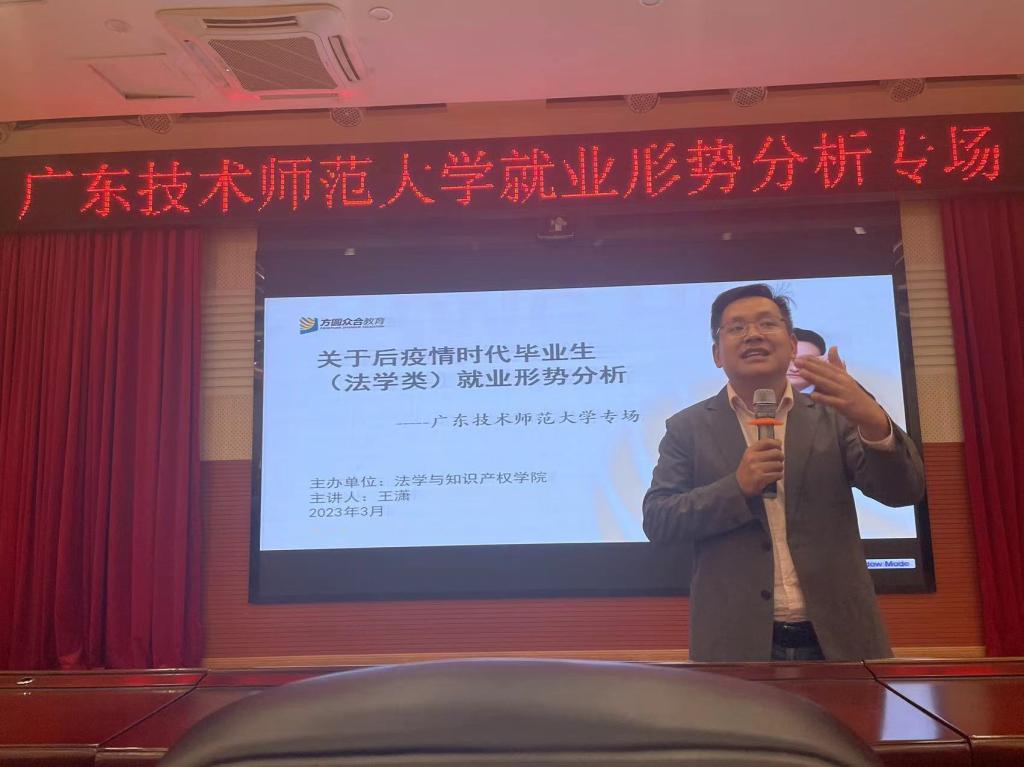 3月24日,williamhill威廉希尔官网院联合广州众合教育在我校白云校区三教104报告厅举办“后疫情时代毕业生(法学类)就业形势分析”专场报告会。报告会由williamhill威廉希尔官网院法律系副主任朱腾伟博士主持,众合教育讲师王潇主讲,两百多名法学专业学生现场聆听。