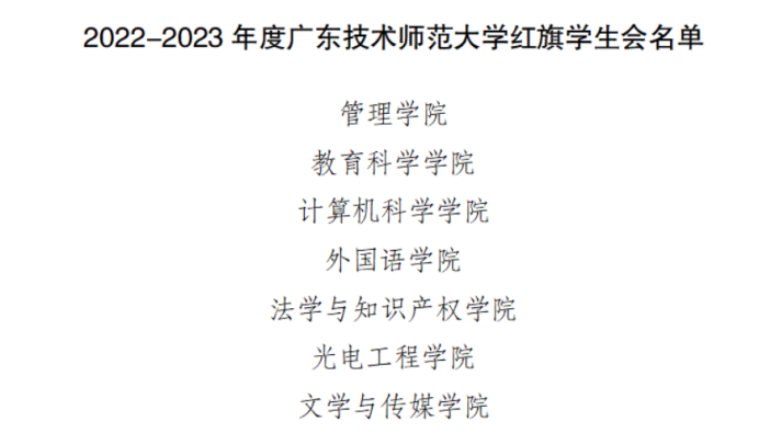 9月初,2022-2023年度广东技术师范大学“红旗学生会”评选结果正式公布。在历时一个多月的学生会互评、现场汇报、评审团打分等环节后,我院学生会经过重重考核,最终取得广东技术师范大学2022-2023年度“红旗学生会”的称号。
