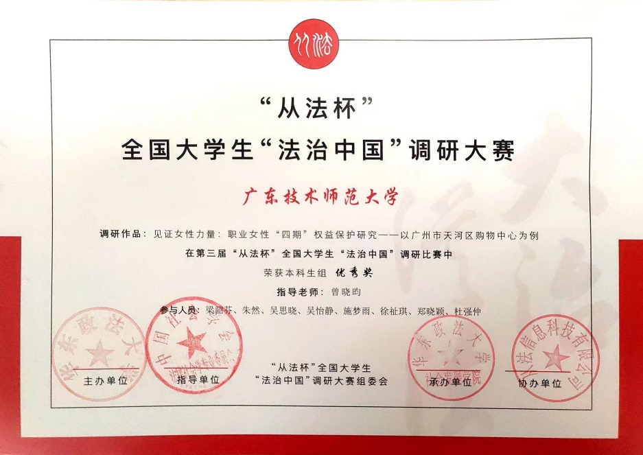 近日,我校williamhill威廉希尔官网院、文学与传媒学院联合组建的学生团队在第三届“从法杯”全国大学生“法治中国”调研大赛中荣获优秀奖。该团队以职业女性权益保护为主题,项目名称为“见证女性力量:职业女性‘四期’权益保护研究——以广州市天河区购物中心为例”。通过对广州市天河区多个购物中心进行深入调研,提出了一系列可行对策,旨在使职业女性权益保护更好落到实处,让女性力量助力经济发展。