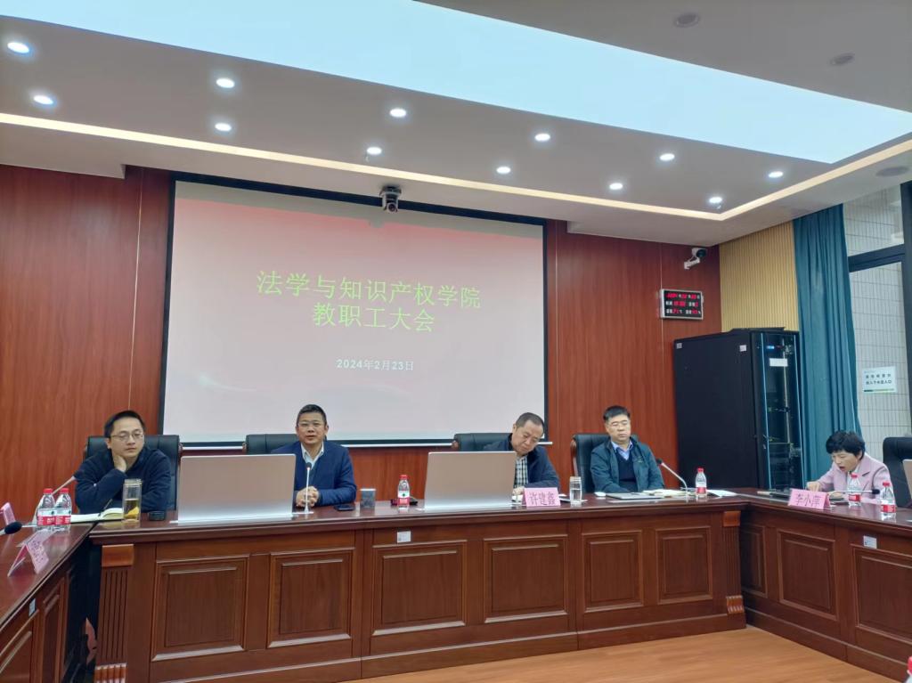 学院院长黄俊辉通报了法律硕士点申报的情况,对过去一年的学科专业建设、师资队伍建设工作等进行了总结。对老师们在教学工作、科学研究、学习交流等工作等提出了明确要求;许建鑫总结了学院党委2023年的主要工作,提出了存在的主要问题,提出了2024年的工作重点:一是用习近平新时代中国特色社会主义思想武装头脑,二是认真做好硕士点申报和本科教育教学审核评估工作,三是推动党建工作与业务工作“双融双促”,四是以高质量党建为引领,推进学院各项工作迈向新台阶。