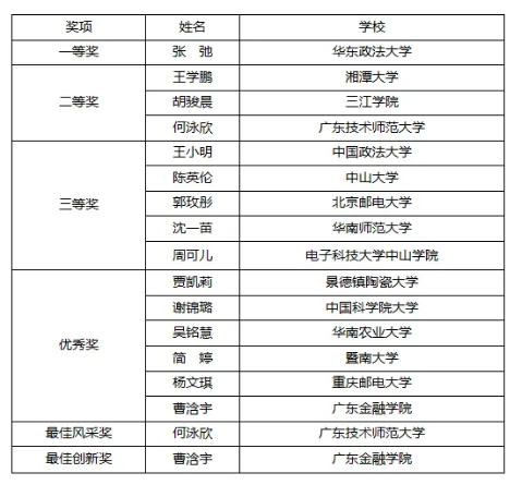 第三届“羊城IP杯”专利检索技能大赛(高校组)获奖名单于6月20日公布,来自中山大学、中国政法大学、华东政法大学、华南师范大学、华南农业大学、湘潭大学、昆明理工大学、广东技术师范大学、新疆医科大学等全国86所高校、1244名在读本科生、硕士生、博士生参赛选手经过初赛、复赛、决赛的激烈角逐最终评选出一等奖1名、二等奖3名、三等奖5名、优秀奖6名,最佳风采奖和最佳创新奖各1名。williamhill威廉希尔官网参赛本科生何泳欣表现优异,荣获二等奖及最佳风采奖,指导老师为沈成燕、陶荣湘、王渊。