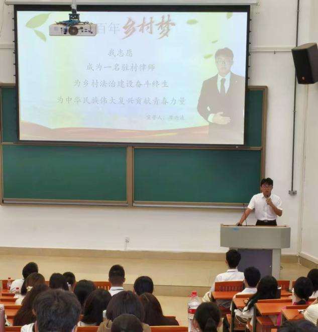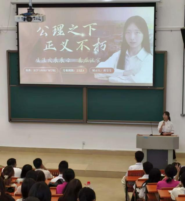 23法学1班廖雨清和23法学4班黄莹莹同学进行职业规划分享。廖雨清通过对自我认知的不断深化,更加坚定了要成为一名驻村律师的决心,黄莹莹则致力于成为一名基层法官,他们均勉励师弟师妹们校期间一定要加强职业生涯规划和学习规划,要端正态度,良好的态度和有效的方法能够帮助事半功倍。除此以外,还鼓励师弟师妹们多参加社会实践,全方面提升自己。