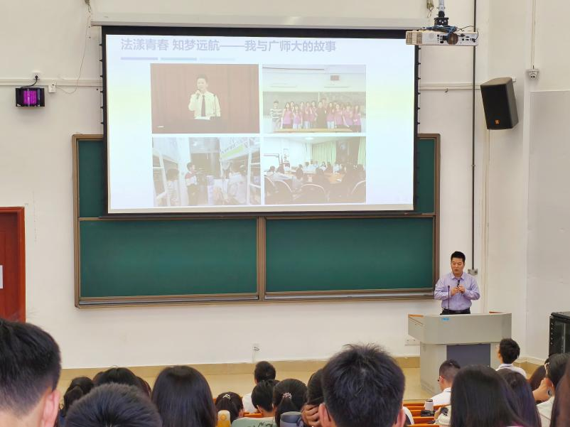 2019级优秀校友鲍浩任以在校期间团学组织部工作和兼职辅导员经历为切入点,给24级新生提了三点建议:一是要夯实基础课程的学习;二是要勇于尝试,不断丰富课余生活;三是要自律,做到生活自理、学习自主、行为自律、人格自尊。最后,他表达了对母校的感恩,鼓励大家要勇敢追梦,以成为广师大学子而骄傲,不断践行广师大精神。