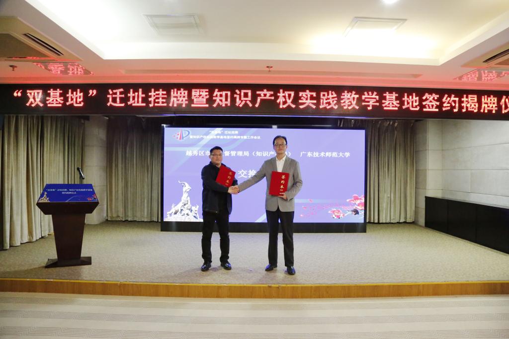 在与会相关领导的见证下孙燕青与越秀区市场监督管理局(知识产权局)负责人共同为“知识产权实践教学基地”揭牌启动,双方还签订并现场交换了《知识产权实践教学基地建设协议书》。