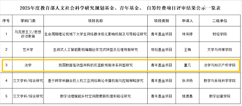 9月25日,教育部社会科学司公布“2025年度教育部人文社会科学研究一般项目立项名单”。我院董凡副教授主持的《我国数据驱动并购的反垄断规制体系转型研究》喜获教育部人文社会科学研究青年基金项目立项,是我院本年度继国家社科基金、广东省特支计划项目、广东省哲学社会科学和广州市哲学社会科学项目成功立项之后的又一重要成果。