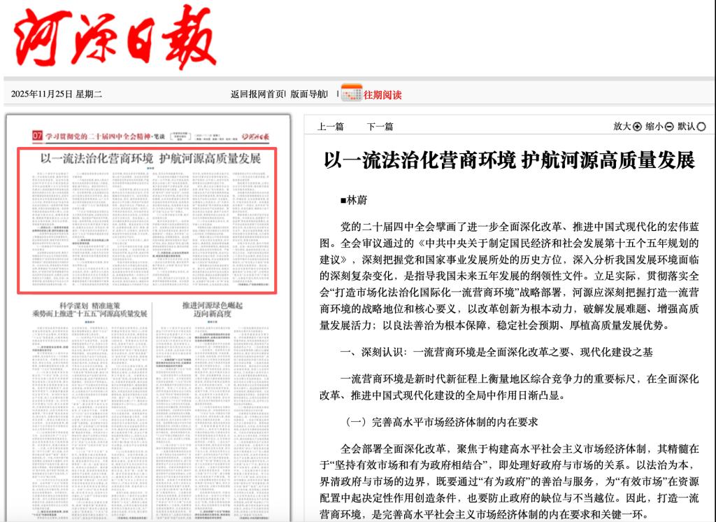《以一流法治化营商环境护航河源高质量发展》紧扣党的二十届四中全会关于“进一步全面深化改革”的战略部署,结合全会审议通过的“十五五”规划建议,深刻阐述了法治是营商环境的核心内涵和根本保障,提出河源作为粤港澳大湾区的重要生态屏障和发展腹地,必须立足自身实际,将打造一流法治化营商环境的改革部署,融入“生态立市”的具体行动,以制度“软实力”驱动发展“硬实力”。