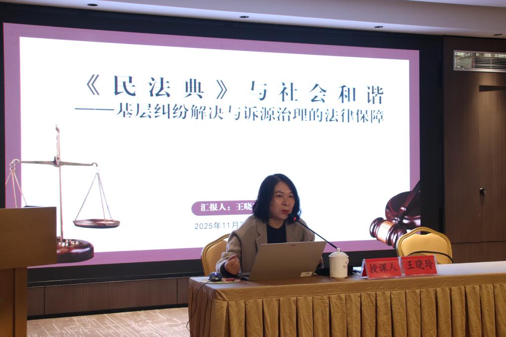 首先,王晓玲以“《民法典》与社会和谐——基层纠纷解决与诉源治理的法律保障”为主题,从法典结构、制度框架、生活中的《民法典》等方面,系统讲解了我国《民法典》的核心内容与司法实践要点。讲座内容有机融入了理论知识与前沿动态,着眼基层民事司法实践现状,引用了11个具体案例揭示出《民法典》作为“社会生活的百科全书”,在司法实践中的具体适用规则。