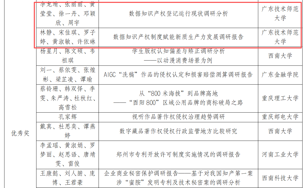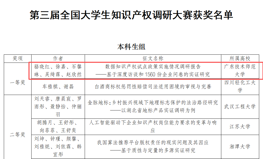 12月27日,第三届全国大学生知识产权调研大赛决赛在重庆理工大学举行,我校参赛队伍历经初赛、决赛的两轮激烈争夺,参赛作品《数据知识产权试点政策实施情况调研报告——基于深度访谈和1560份企业问卷的实证研究》脱颖而出(团队成员:骆晓红、徐嘉、吴绮霖、石馨琳、赵欣然,指导教师:汤贞友),获得本次大赛本科生组最高奖项一等奖。同时,我校《数据知识产权登记运行现状调研分析》和《数据知识产权制度赋能新质生产力发展调研报告》获得优秀奖。