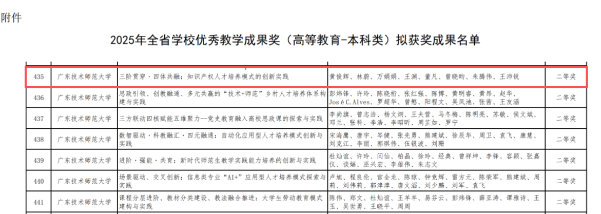 日前,广东省教育厅正式公布了2025年全省学校优秀教学成果奖(高等教育-本科类)获奖成果名单。我院院长黄俊辉教授领衔,林蔚、万娟娟、王渊、董凡、曾晓昀、朱腾伟、王沛锐等教师共同完成的教学成果《三阶贯穿·四体共融:知识产权人才培养模式的创新实践》,荣获广东省级教学成果奖(高等教育-本科类)二等奖,实现了我院在该奖项上零的突破。