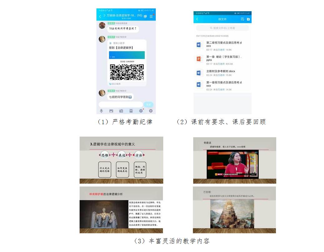 该教学模式以“思维+表达”为主线,遵循“目标明确、平台集中、资源优化、寓教于乐”的总体理念,充分发挥两位教师在理论教学和案例教学方面的特长和资源,循着“课前预习”、“课堂讲授”、“课后复习”的体系结构,熟练运用QQ群课堂及相关线上丰富资源,让学生在新颖的学习氛围中获得知识,提升能力。具体包括以下几个板块:(1)音频直播授课。按照课程内容和教材章节,通过QQ群课堂进行知识点讲授;(2)群组讨论。通过教师发布的问题或课程材料,组织学生在群课堂申请连麦开展在线群组讨论,将学生发言的频次和效果计入该生平时成绩;(3)通过群课堂的签到功能、群共享功能,进行班级教学管理、发布教学资料、布置作业和批改作业;(4)利用爱课程上的优秀开放课程或专题讲座,以问题为导向,给学生边观看边讲解,指导学生在特定知识点做笔记,要求学生反馈心得、提出问题;(5)为努力降低深奥的法律逻辑给学生造成的智识冲击,通过播放头脑风暴型短视频(涉法辩论)、思辨型短视频(奇葩说)、影视剧案件分析短视频(学生喜闻乐见的法律电影电视剧短视频),带入“知识点角色”,经常性激发学生的学习兴趣;(6)在线课程考查。将授课内容、专题讲座、案例分析、群组讨论内容等融入考查范围,全面考查学生普通逻辑基础知识、法律思维和法律方法的应用、案例分析及推理的综合能力。