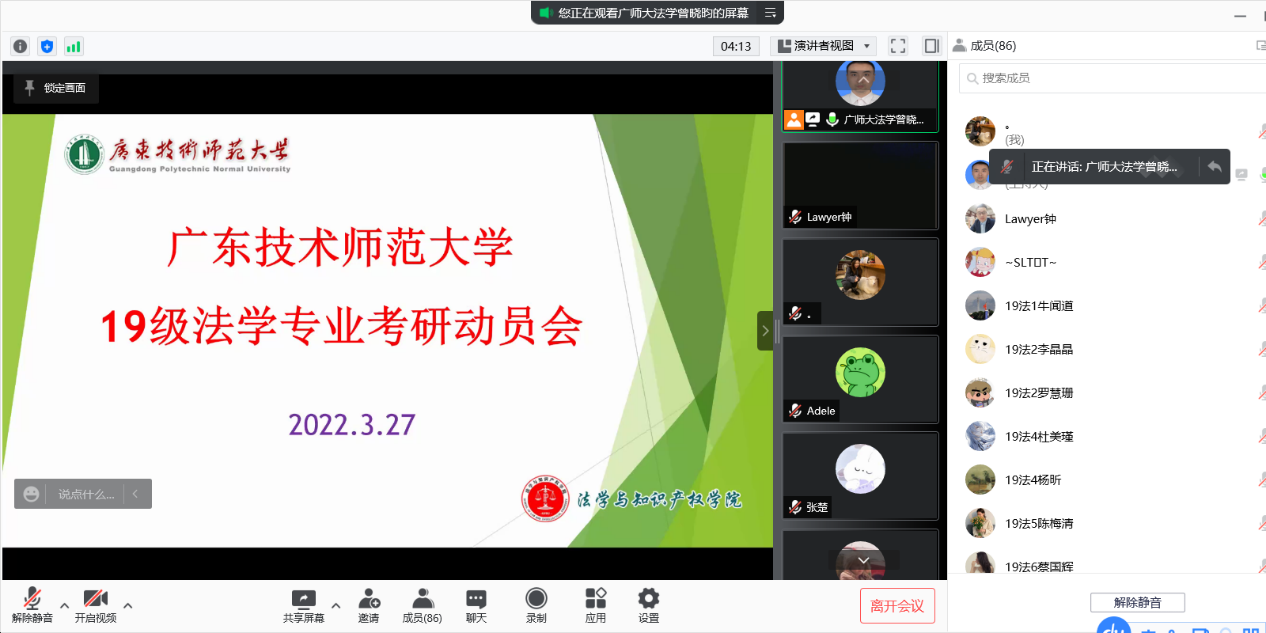 3月27日晚,我院通过腾讯会议举办2019级考研动员大会。我院法学专业负责人、法学系负责人、知识产权系负责人及多位校友、有意考研学生,共约90人参与了本次会议。会议由法学专业负责人曾晓昀博士主持。
