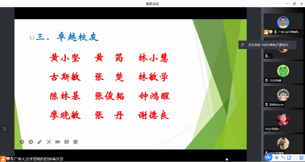 黄小坚、黄筠、林小慧、古斯敏、张楚、林敏学、陈林基、张俊韬、钟鸿醒、廖晓敏、张丹、谢德良等卓越校友在线与师弟师妹进行深度交流,回忆考研岁月,感恩母校多年来的关爱。自由交流环节,同学们踊跃提问,嘉宾们开怀畅谈,线上气氛热烈。大家纷纷表示要向师兄师姐学习,更上一层楼。