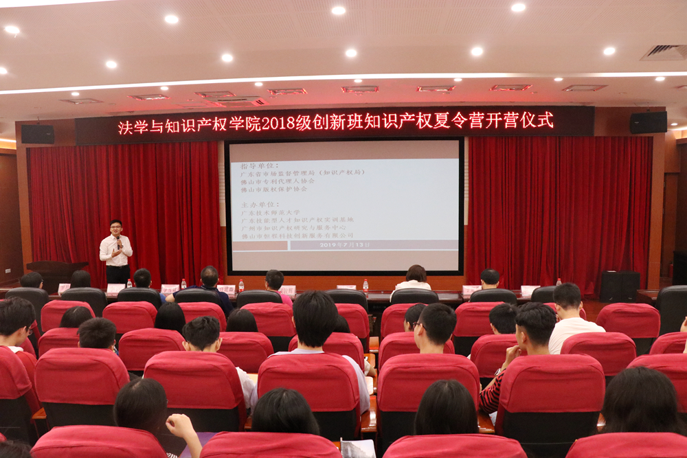 为探索知识产权人才培养新模式,切实培养一批具有较强实务能力的知识产权人才,吸引更多在校学生认识和关注知识产权行业,提高师生对知识产权实务的认知水平,7月13日,我院在白云校区三教104报告厅举行2018级创新班知识产权夏令营开营仪式。我院全体党政领导班子、党政办公室、辅导员,佛山市恒程科技创新服务有限公司总经理刘咏平、知识产权专员及2018级法学创新班全体学生参加了开营仪式。仪式由我院副院长郭洪波主持。