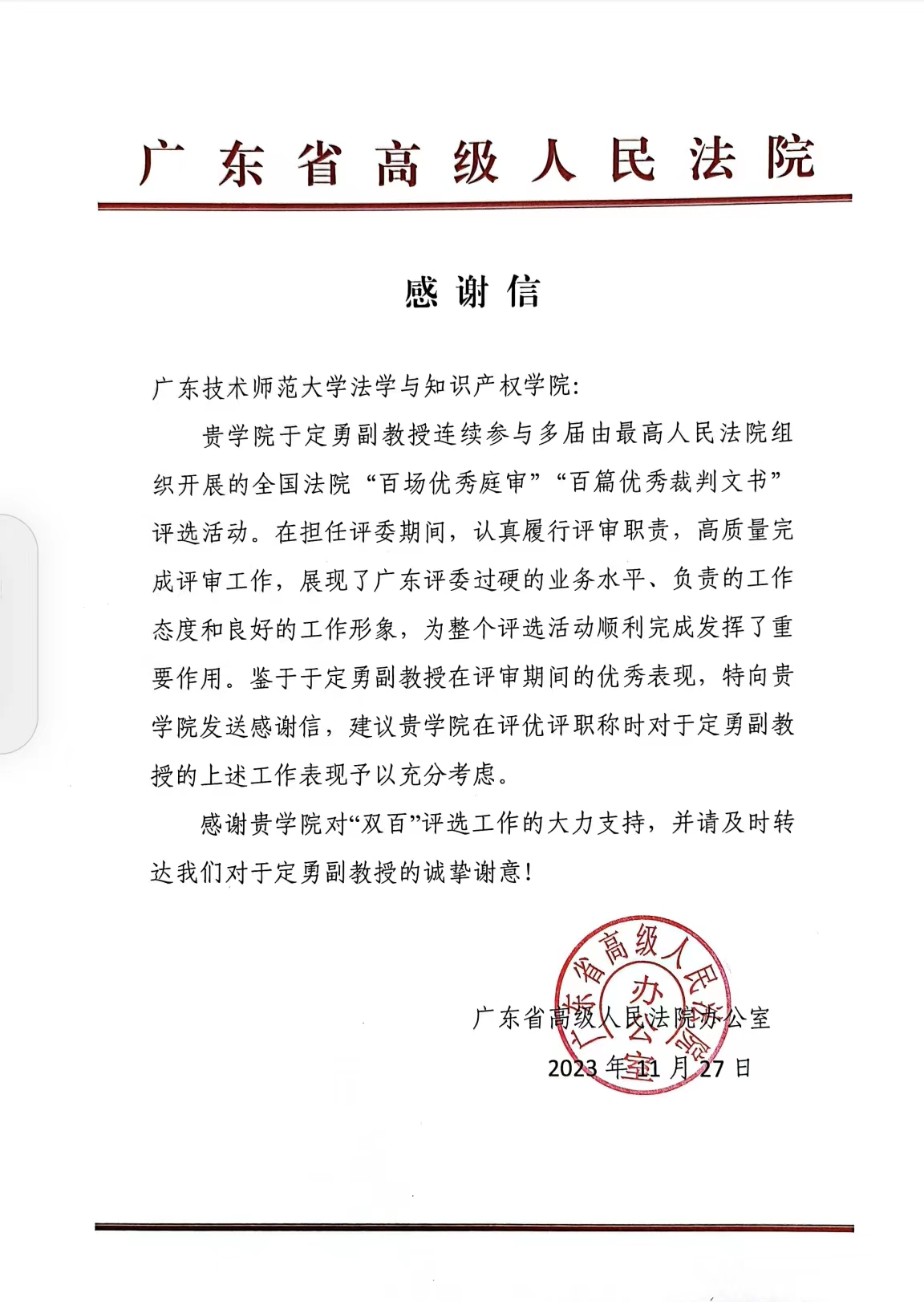 近日,williamhill威廉希尔官网院收到广东省高级人民法院感谢信,副教授于定勇连续参与多届最高人民法院组织开展的全国法院“百场优秀庭审”“百篇优秀裁判文书”评选活动。在担任评委期间,认真履行评审职责高水平完成了评选任务,展现了我校教师良好的工作形象、过硬的业务水平、负责的工作态度,受到了广东省高级人民法院的肯定和表扬。