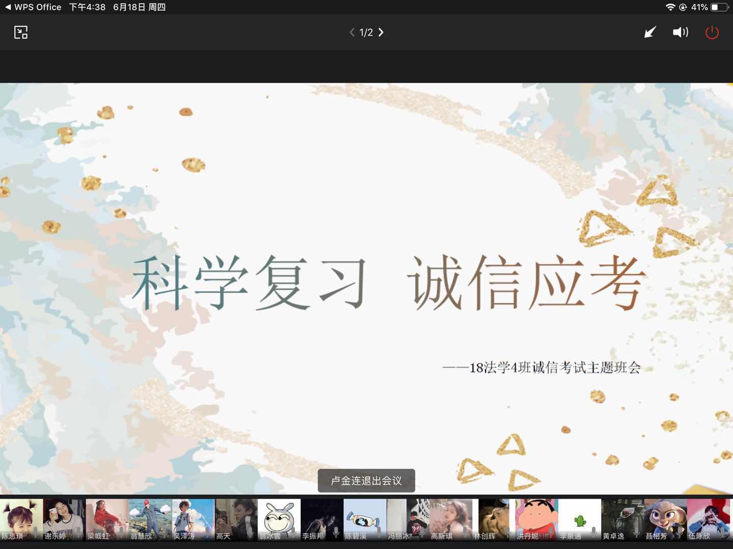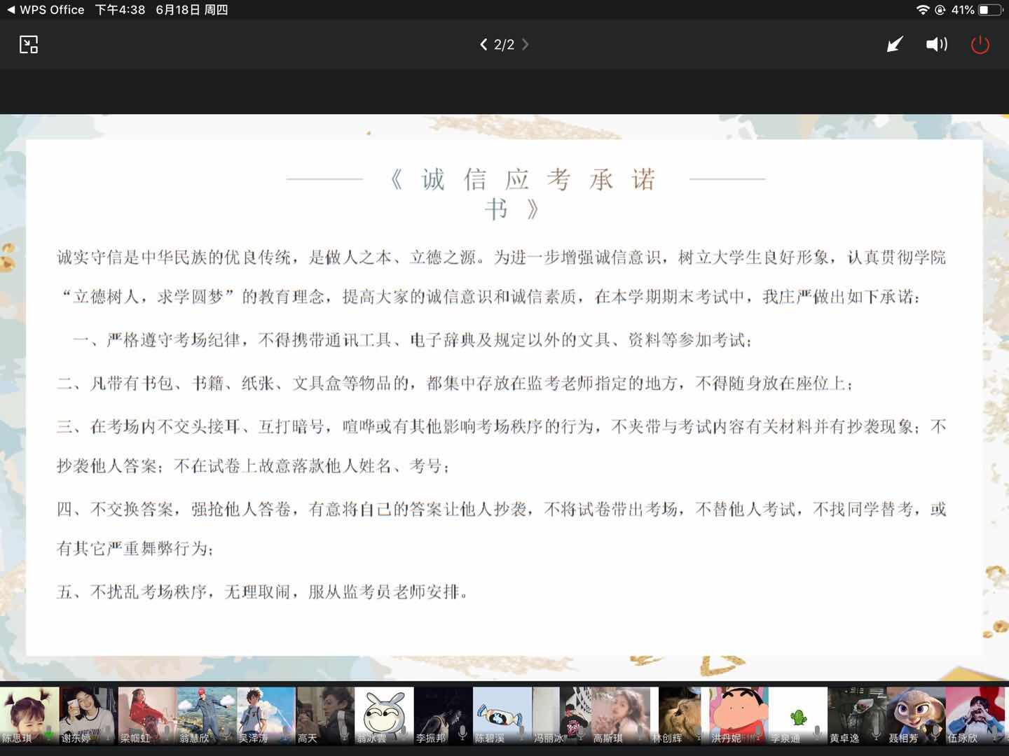 为加学风、考风建设,严肃校规校纪加强诚信教育,保证疫情期间期末考试顺利进行,6月18日至21日,各班组织召开疫情期间诚信考试主题班会。