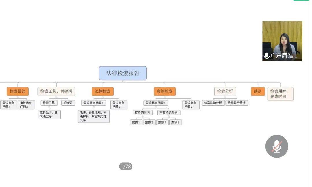 随后,广东康浩律师事务所陈东萍律师就“如何制作一份合格的法律检索报告”这一主题为参赛选手开展培训讲座,讲座内容包括法律检索报告的意义与常见问题、报告的基本框架及制作步骤、检索过程中使用的工具与方法。培训过程中,陈律师细心讲解,传授的法律检索方法使同学们受益匪浅。讲座最后的问答环节中,同学们踊跃提出自己的疑惑,陈律师耐心解答,为同学们提供帮助。第一届法律检索报告开幕式暨第一次培训大会圆满结束。