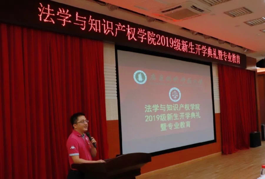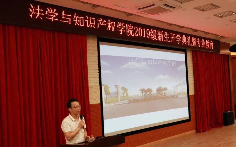 在全场奏唱国歌后,黄俊辉院长致辞,对2019级新生的到来表示热烈的欢迎,并与新生分享三句话。一是成绩代表过去不代表未来二是读好书,交好友三是趣学法学,活学法学。