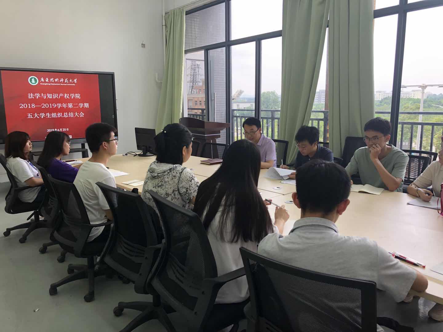 6月27日,我院组织2018—2019学年第二学期五大学生组织总结大会,学院副院长于定勇、辅导员梁嘉乐以及学院模拟司法院、法律服务中心、学生创新创业中心、辩论队、知止读书会五大学生组织主要负责人参加总结大会。