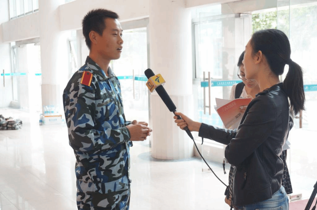 比赛结束后,我校参加过“9·3”国庆阅兵的陈辉辉同学受到了广东电视台的现场采访。在采访的过程中,陈辉辉同学分享了他在带领我校学子参加此次比赛的体会与感想,并分享了他参加“9·3”阅兵的光荣经历。