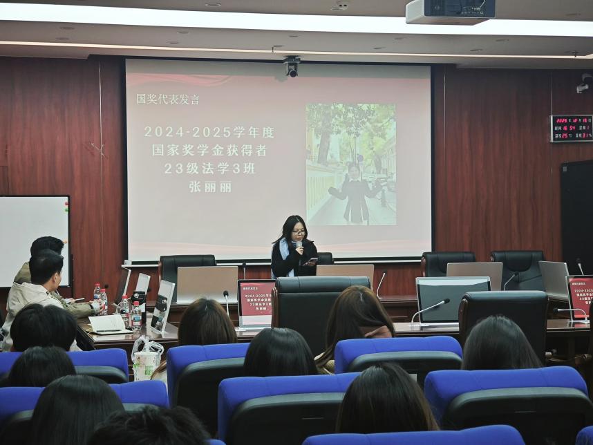 2024-2025学年度国家奖学金获得者23法学3班张丽丽分享了她的学习成长经历,建议学弟学妹们利用课余时间积极投身学科专业竞赛,如模拟法庭、法律检索大赛等,以赛促学,以赛促行。2024-2025学年度国家励志奖学金获得者23法学1班陈春娟和23法学3班姚佳灿同学结合自身实习经历,建议师弟师妹们早做准备,在实践中探索未来。