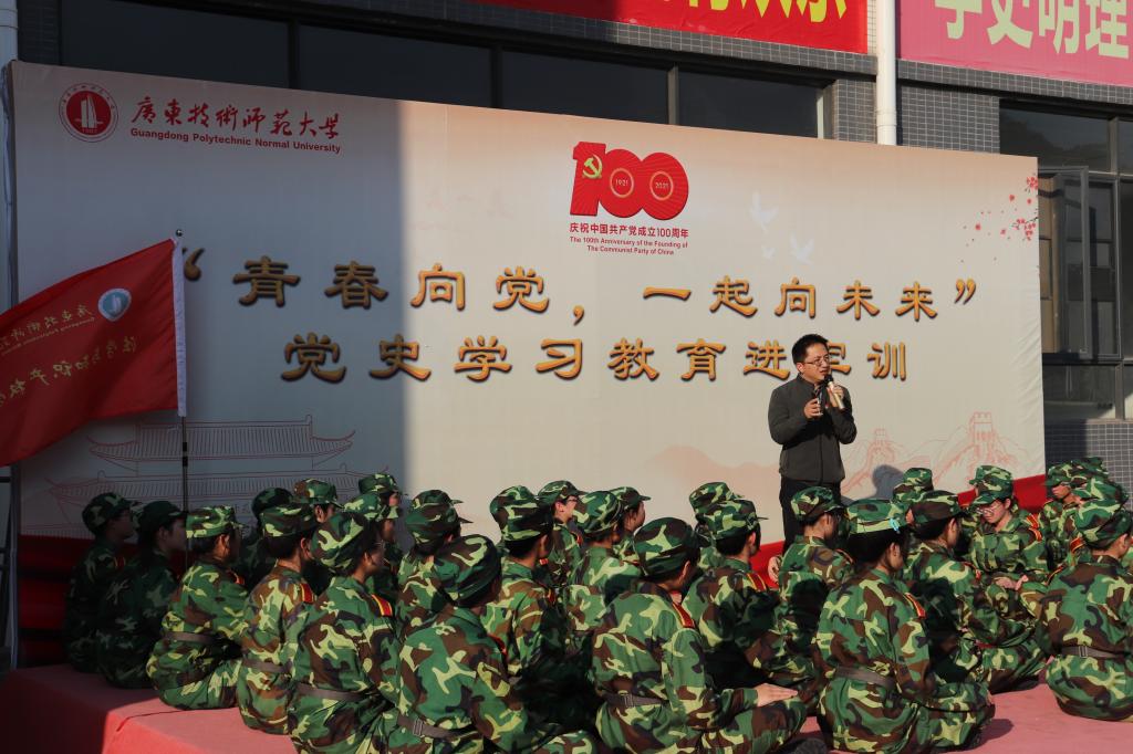 1月8日,李雪斌以“青春向党,一起向未来”为主题,向2021级参训学生讲授微党课。李雪斌从《绝命后卫师》中担负中央红军后卫任务的红34师英雄师长陈树湘“断肠明志,誓为苏维埃流尽最后一滴血”的感人故事,以及《士兵突击》钢七连队“不抛弃、不放弃”的精神,带领同学们回顾了悲壮血战的烽火岁月,激励同学们学习军人英勇顽强、舍生忘死的精神。李雪斌寄语参训学生,希望能树立坚定的理想信念和革命乐观主义精神,发扬军人不怕苦不怕累的优良作风,增强集体荣誉感,发扬集体主义精神,珍惜训练机会,脚踏实地完成好每一次训练,扎扎实实完成好学业,在担使命和干事业中实现自己的人生价值。