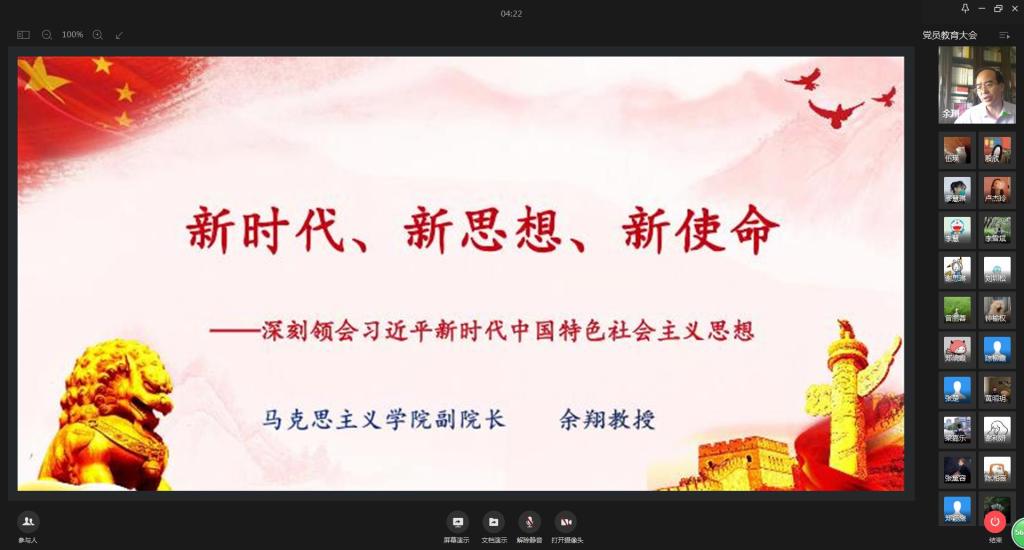 在习近平新时代中国特色社会主义思想内容解读方面,余翔教授从思想中“八个明确”和“十四个坚持”的内容出发,结合国内国际形势,谈及到我国现阶段经济、社会、军事、外交等各方面等情况,尤其是谈到了新冠肺炎疫情期间,党带领全国人民取得的阶段性疫情防控胜利,这是国外许多国家都未能所及的,无不彰显着中国共产党作为执政党全心全意为人民服务的宗旨,彰显着社会主义的优越性。