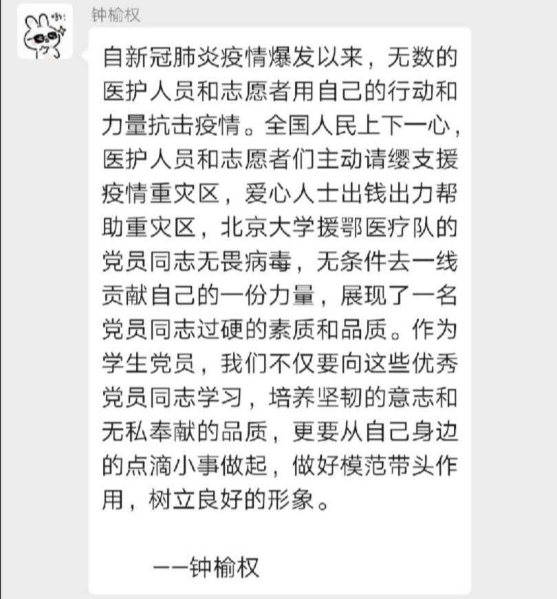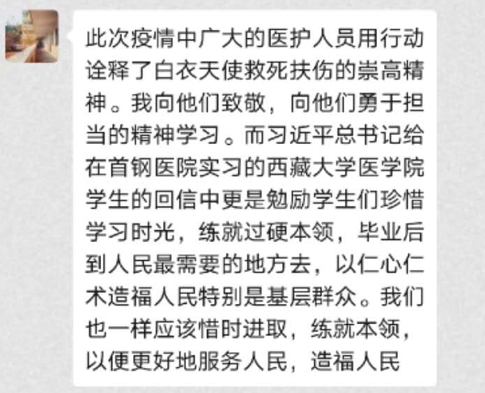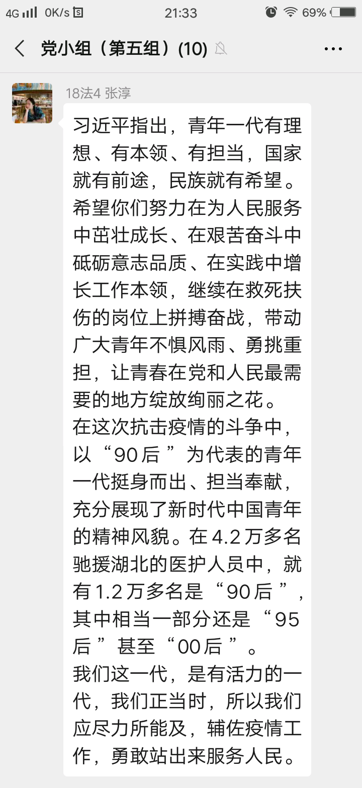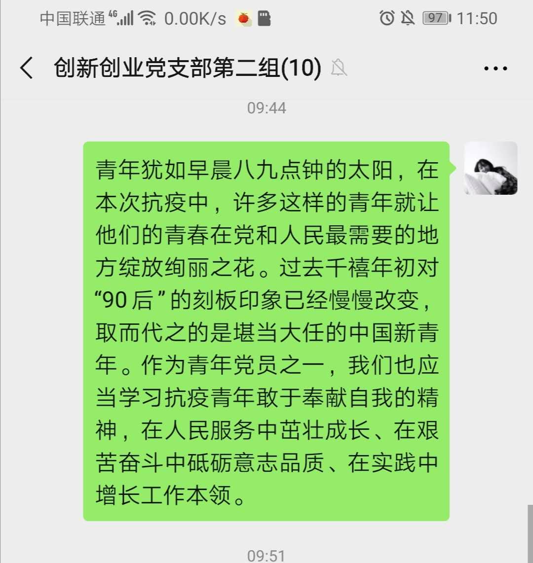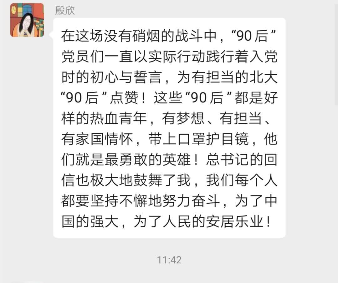 3月15日,习近平总书记给北京大学援鄂医疗队全体“90后”党员回信,向他们和奋斗在疫情防控各条战线上的广大青年致以诚挚的问候。williamhill威廉希尔官网院学生创新创业党支部第一时间组织发动党员青年以自主学习+线上交流的方式开展以“读习近平总书记勉励“90后”党员的回信有感”为主题的专题学习,引领党员青年开展学习。以下为党支部的精选心得,跟着小编去看看各个党员的深刻感悟吧~