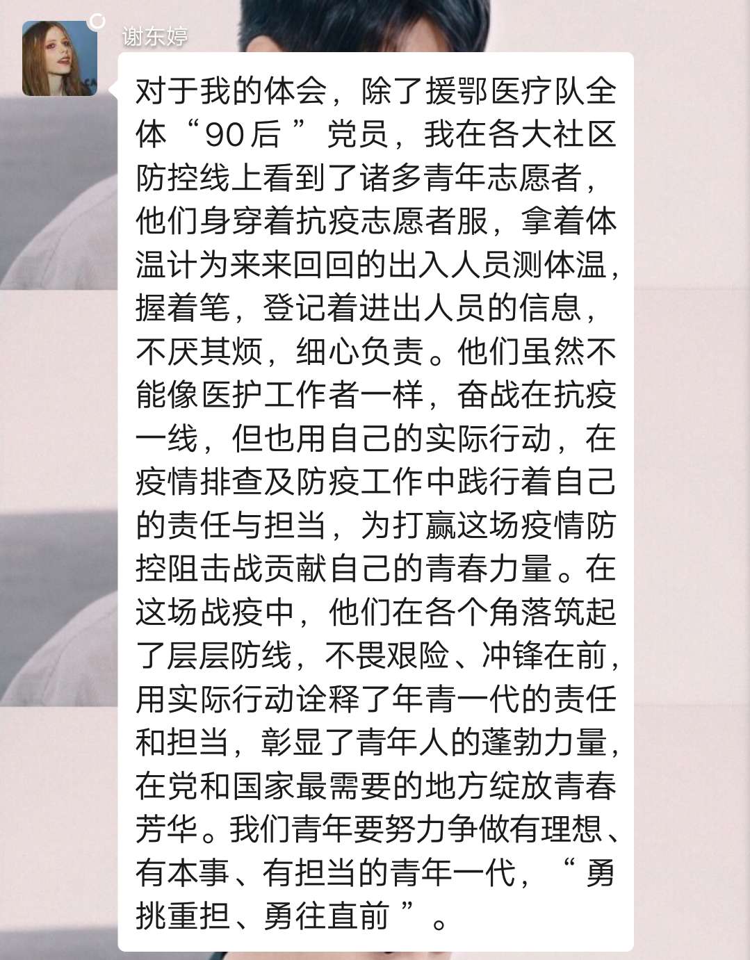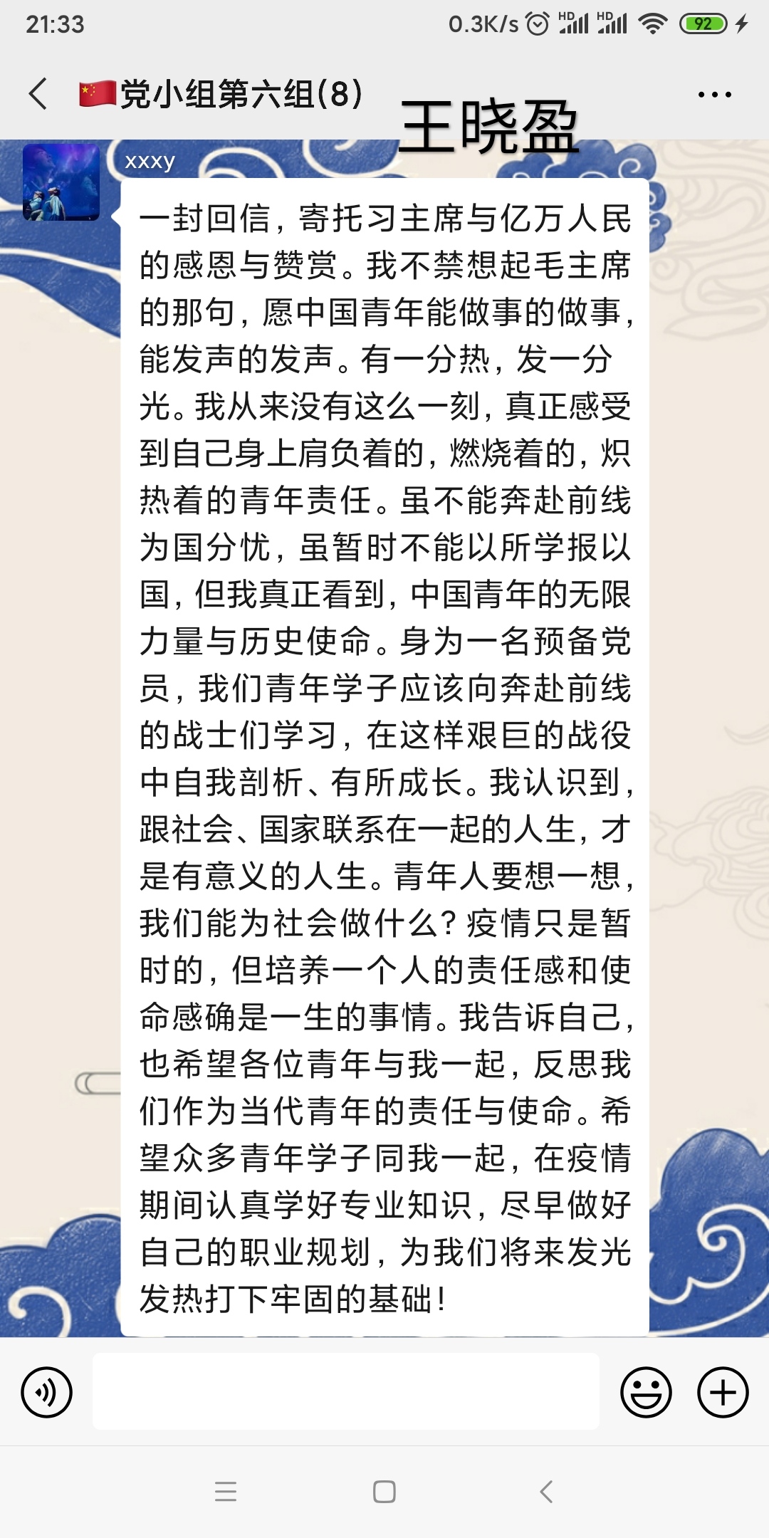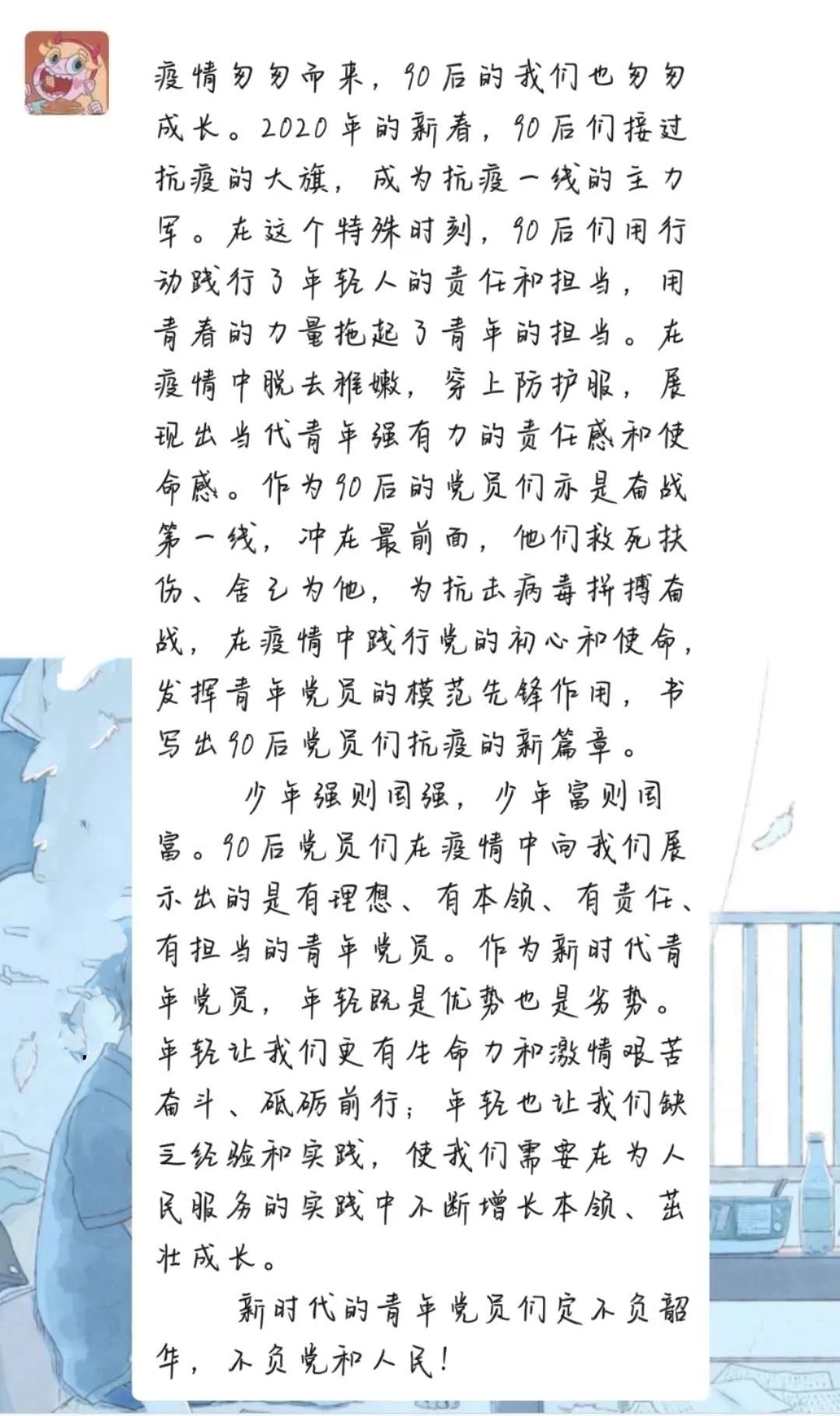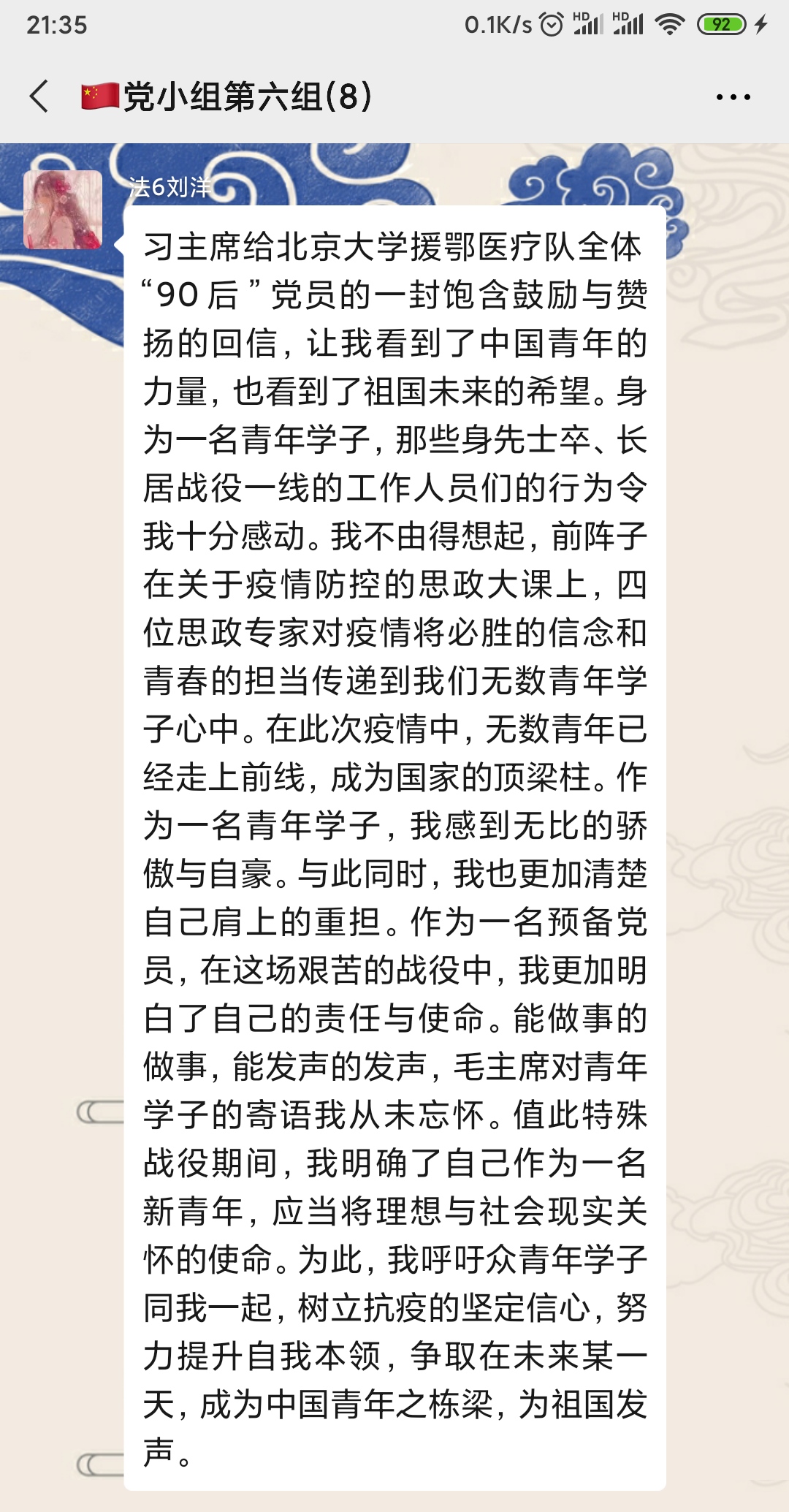3月15日,习近平总书记给北京大学援鄂医疗队全体“90后”党员回信,向他们和奋斗在疫情防控各条战线上的广大青年致以诚挚的问候。williamhill威廉希尔官网院学生创新创业党支部第一时间组织发动党员青年以自主学习+线上交流的方式开展以“读习近平总书记勉励“90后”党员的回信有感”为主题的专题学习,引领党员青年开展学习。以下为党支部的精选心得,跟着小编去看看各个党员的深刻感悟吧~