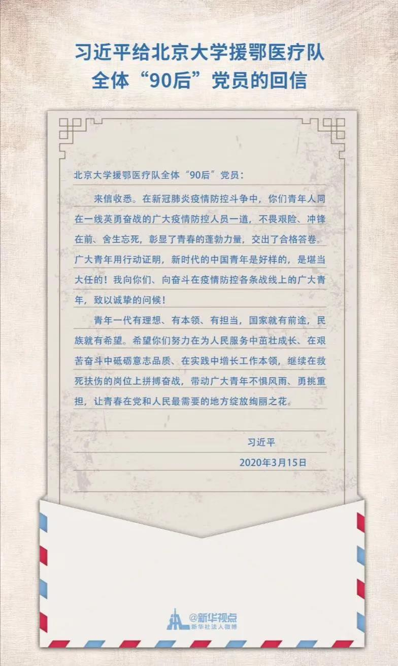 近日,北京大学援鄂医疗队的34名“90后”党员给习近平总书记写信,汇报了在抗疫一线抢救生命的情况,表达了继续发挥党员作用、为打赢疫情防控阻击战贡献力量的决心。习近平总书记3月15日给北京大学援鄂医疗队全体“90后”党员回信,向他们和奋斗在疫情防控各条战线上的广大年致以诚挚的问候,勉励广大青年在为人民服务中茁壮成长、在艰苦奋斗中砥砺意志品质、在实践中增长工作本领,让青春在党和人民最需要的地方绽放绚丽之花。