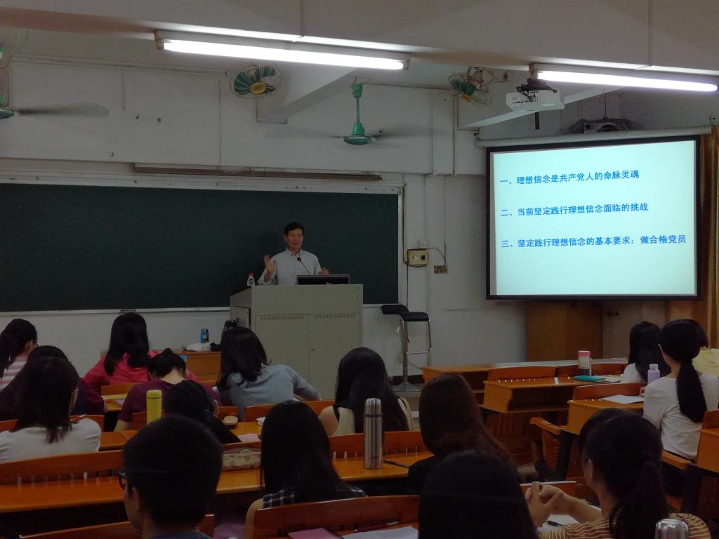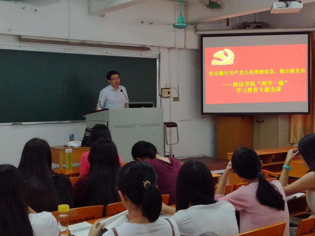 10月21日下午,政法学院原教工党支部书记、原学校教学督导、政法学院关工委符文品老师在A403教室以“坚定践行共产党人的理想信念,做合格党员”为主题,给全院学生党员及入党积极分子上了一堂精彩的“两学一做”专题党课。学院非毕业班学生党员以及全体入党积极分子聆听了本次党课,学院党委陈军副书记和辅导员赵璐老师出席本次活动。符文品老师首先从理想信念与人生价值观的差异入手,将个人、政治集团、国家社会三个方面的理想信念差异带来的后果进行比较,通过党和国家的发展历史,证明坚定践行共产党人理想信念的关键性。然后从党员的角度,理论联系实际,说明党的十八大文件和习近平总书记一再强调坚持党的理想信念的重要性,引导我们通过“两学一做”学习教育,做一名合格的共产党员。接着,他从理想信念是共产党人的命脉灵魂、当前坚定践行理想信念面临的挑战和坚定践行理想信念的基本要求是做合格党员这三个方面进行论述,通过古今中外的历史,深入浅出,阐明为什么今天还要强调坚定践行共产党人的理想信念,才能做一名合格的共产党员。